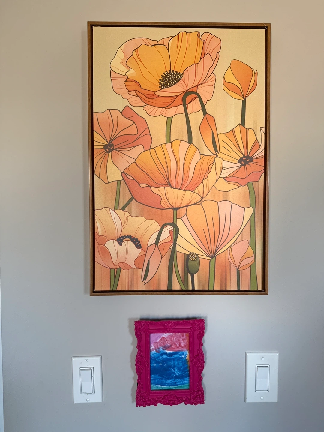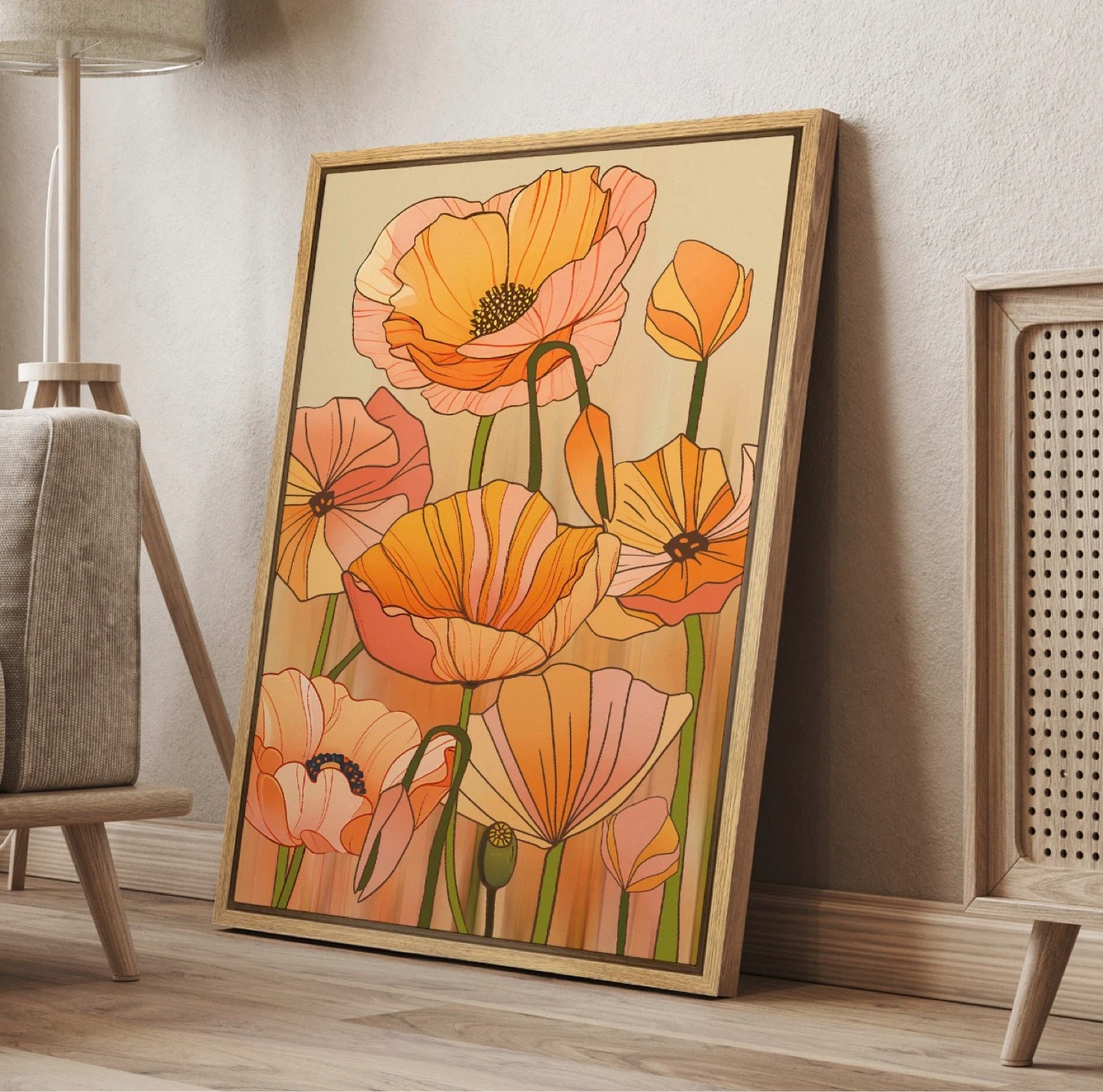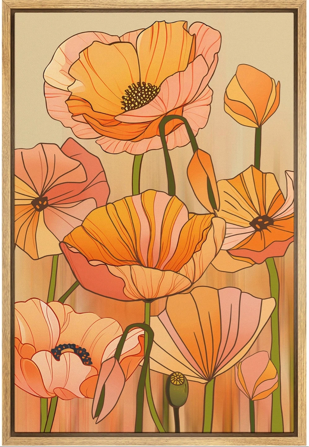 Canvas print of vibrant orange and pink poppies. Framed in a simple wood-tone border and easy to hang! Adds a cheerful pop of color to any room!