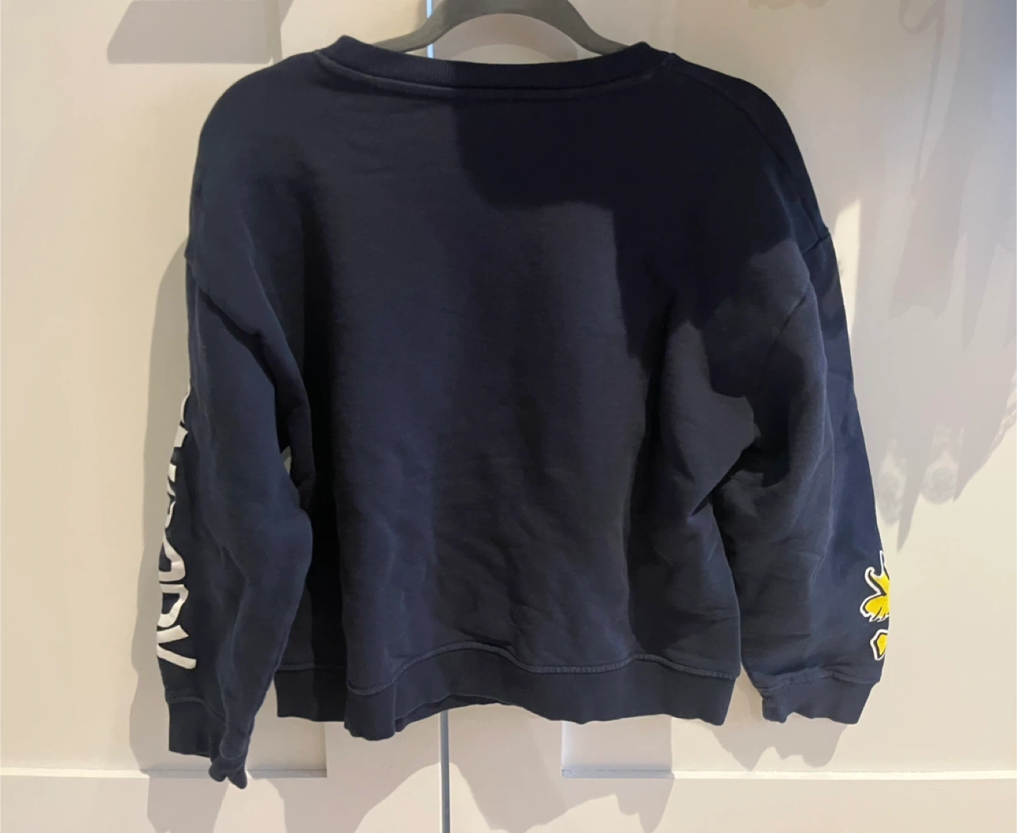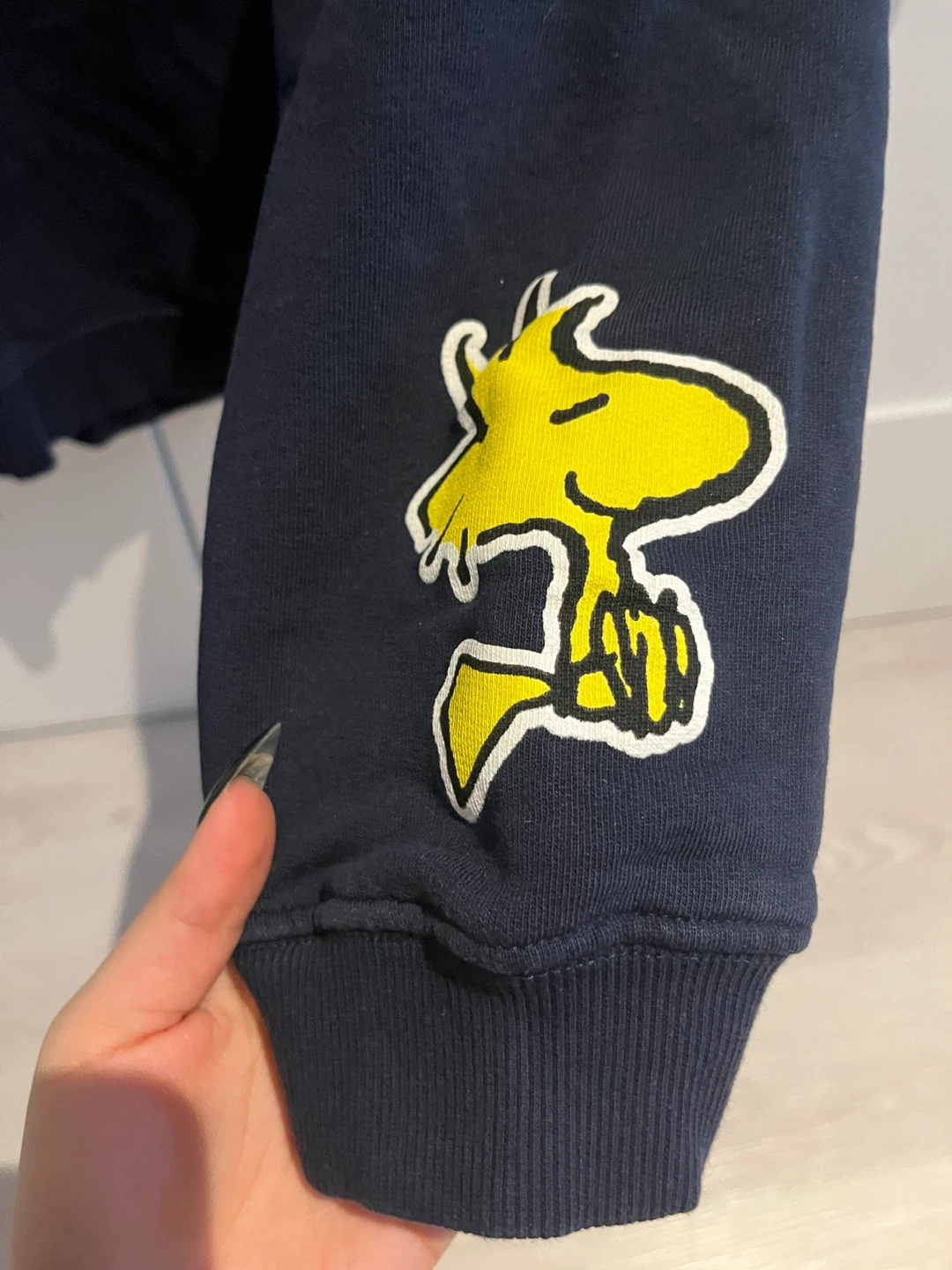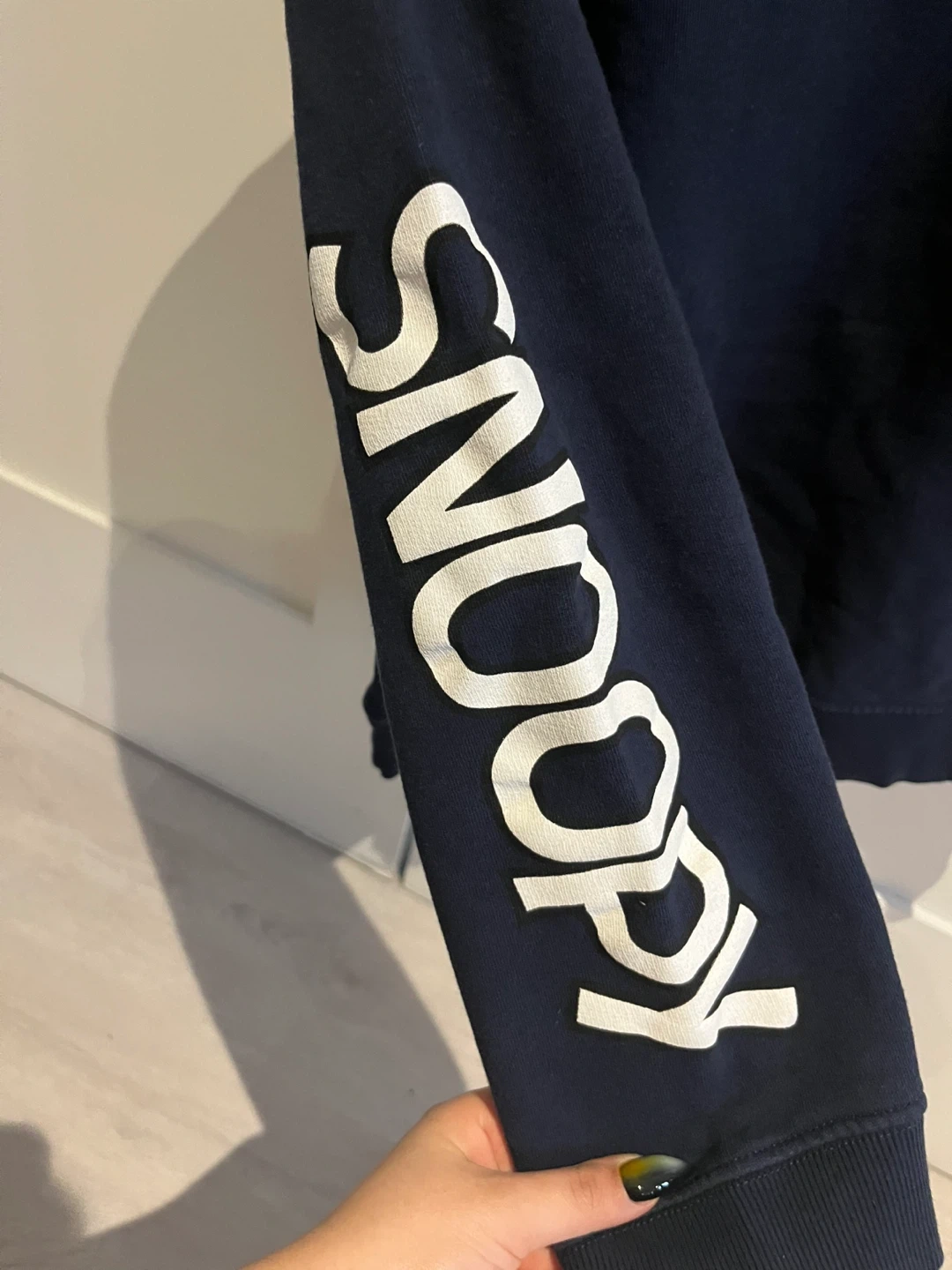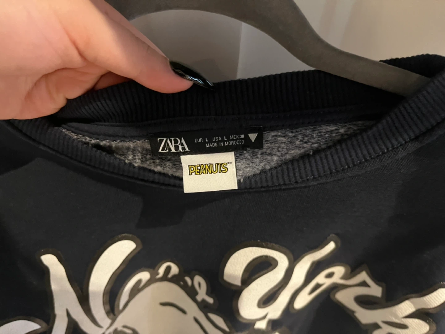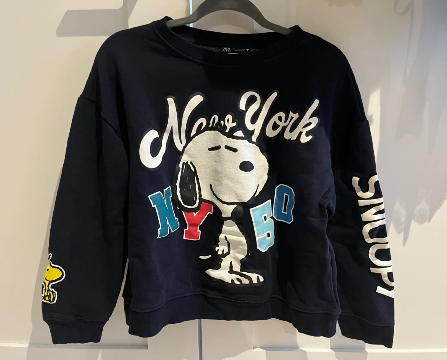 Navy blue crewneck sweatshirt from ZARA featuring Snoopy and "New York" graphics on the front and "Snoopy" text down the sleeves. It's a Size L. Great for casual wear!