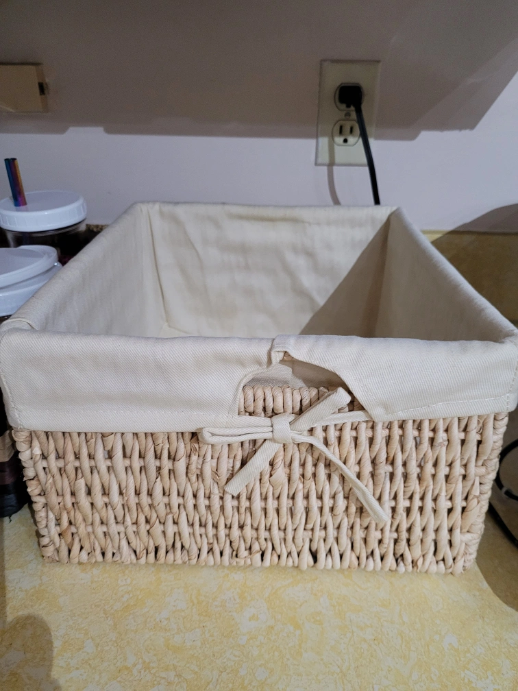 Wicker baskets with cream colored linings. Sold as set of two. one bigger one and one slightly smaller.