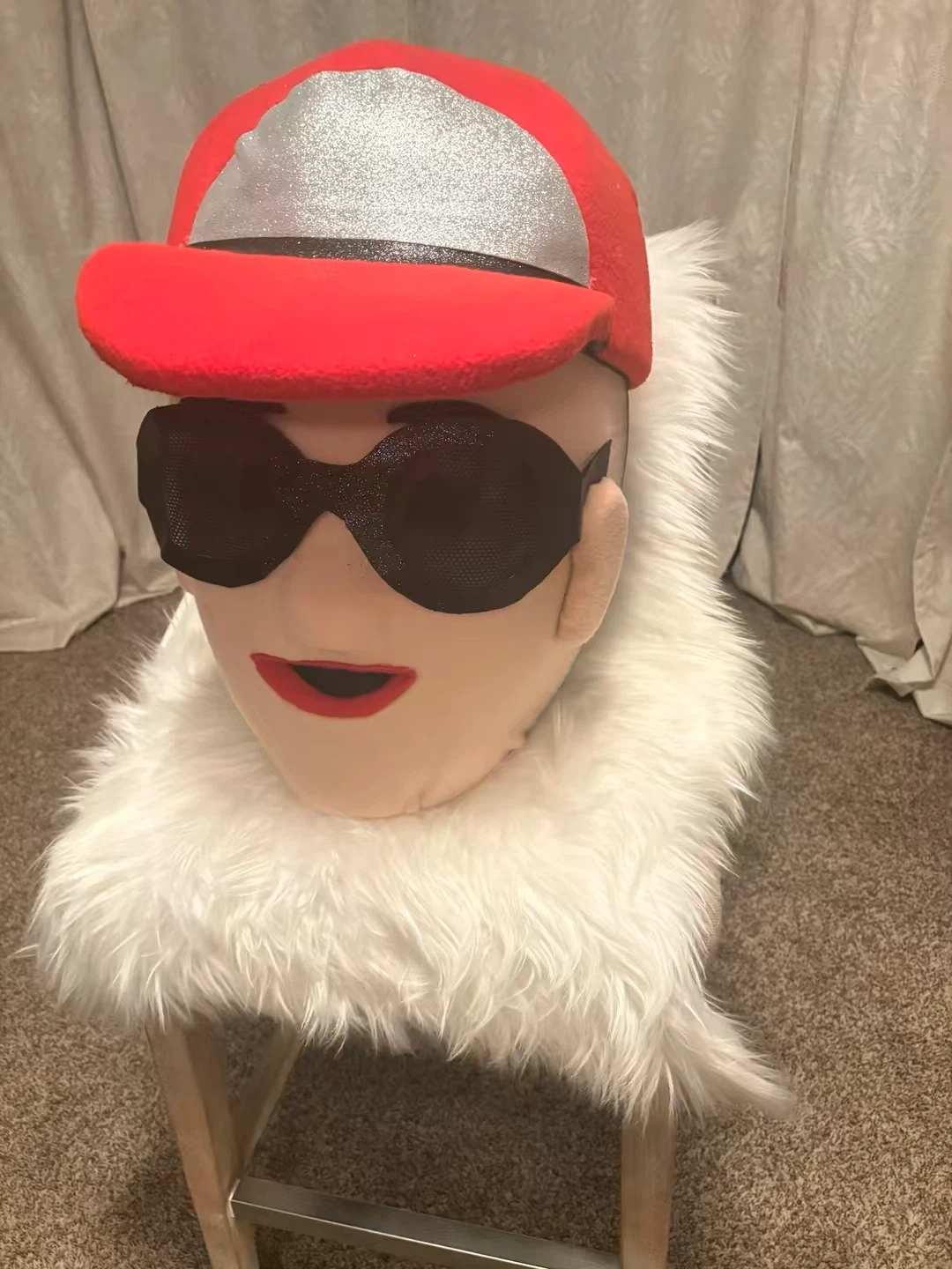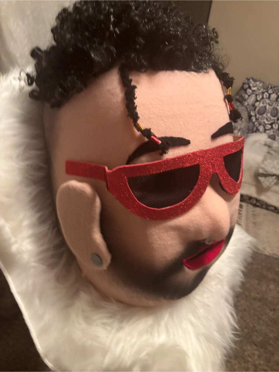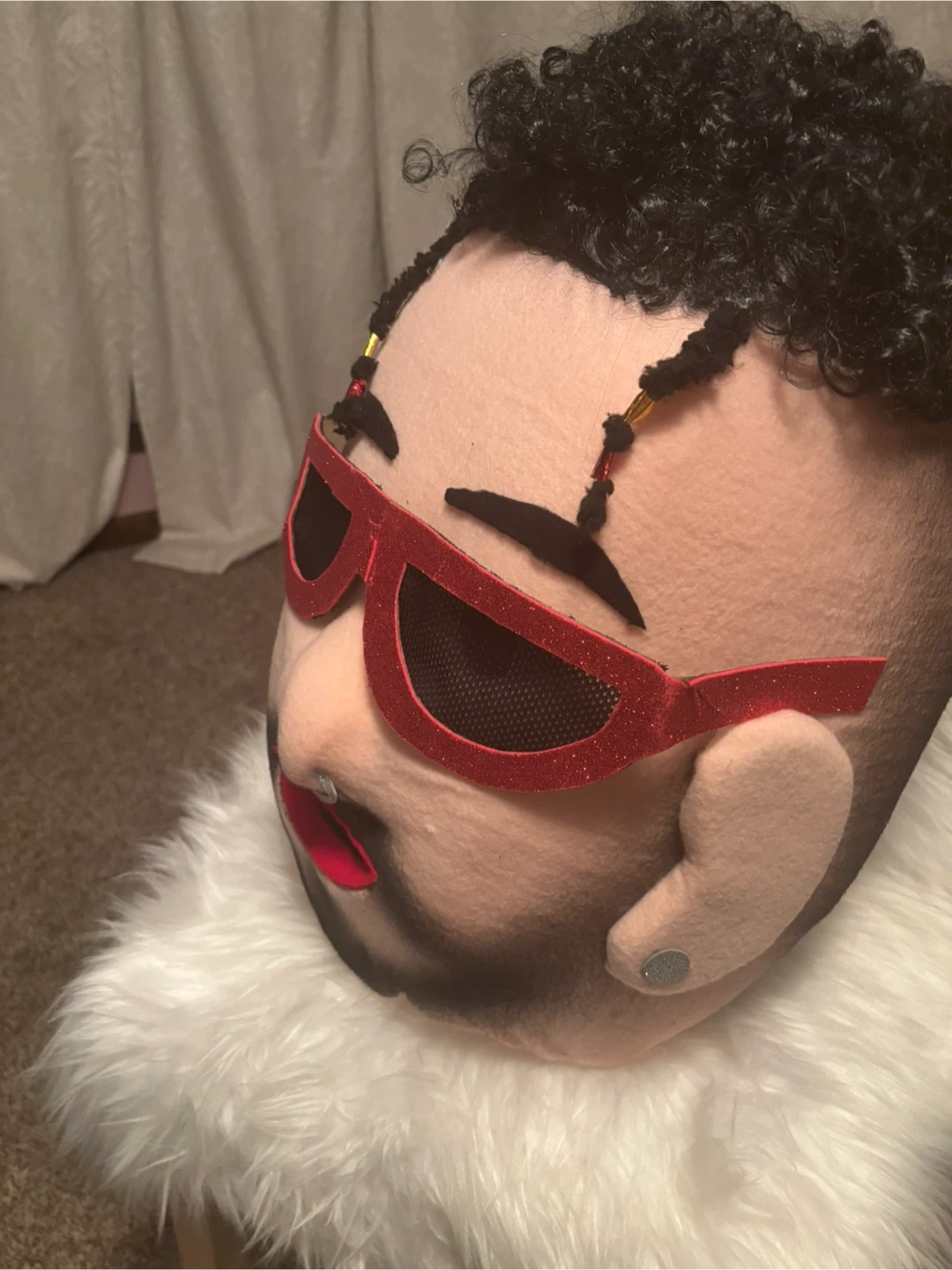 This is a handmade plush head mask designed to look like the artist Bad Bunny. It's a fun accessory for costumes or parties! The mask is made of soft fabric.