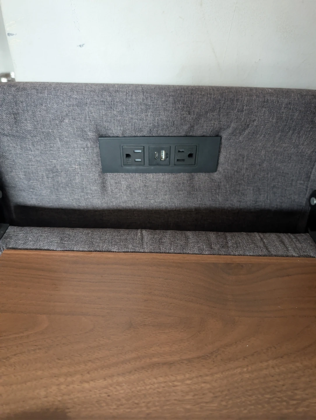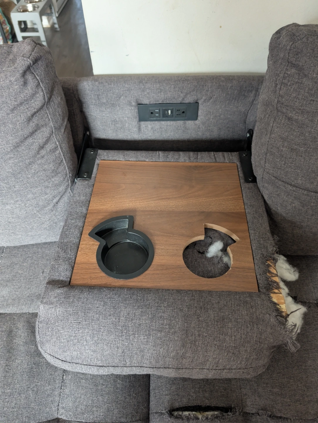 It features a built-in cup tray and a working charging station with USB ports and outlets.
