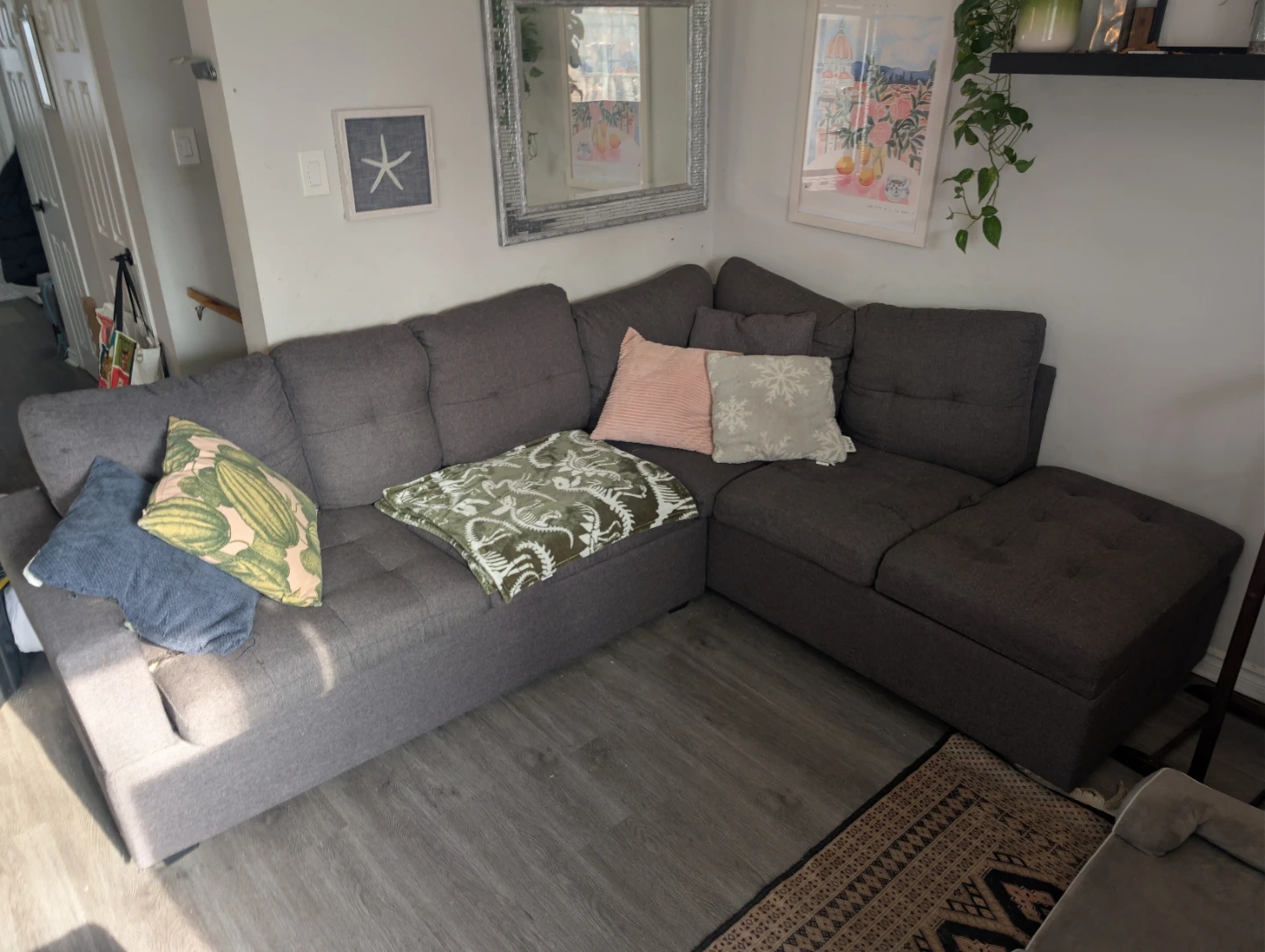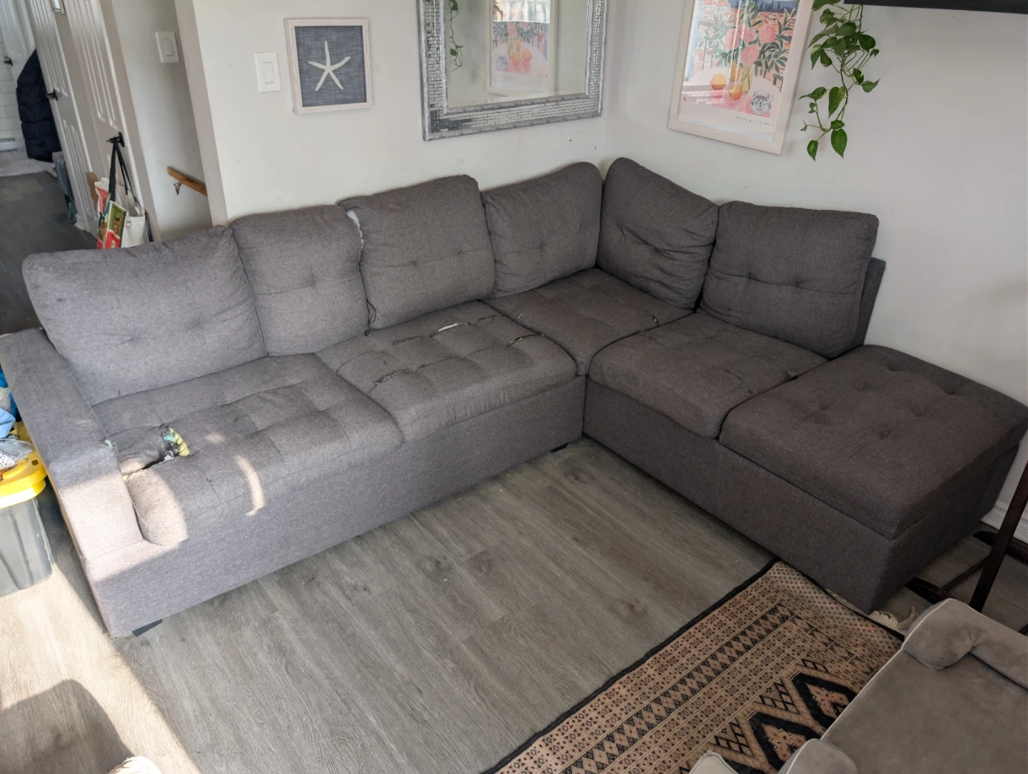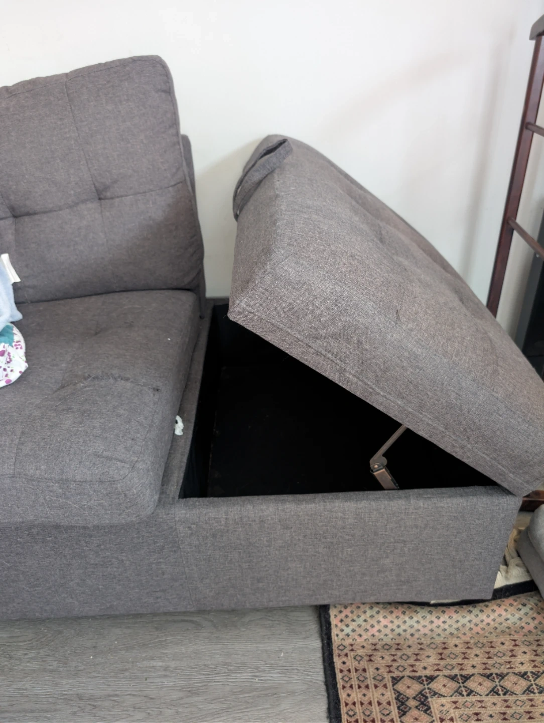 This grey sectional sofa offers convenient storage underneath the seats.