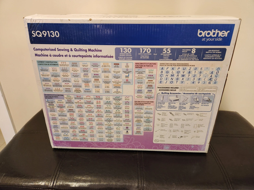 This powerhouse machine includes 130 unique built-in sewing stitches including unique, decorative, heirloom and quilting stitches, with 8 styles of one-step auto-size button holes. also includes 1 built-in seeing front with 55 alphanumeric stitches for basic monogramming.