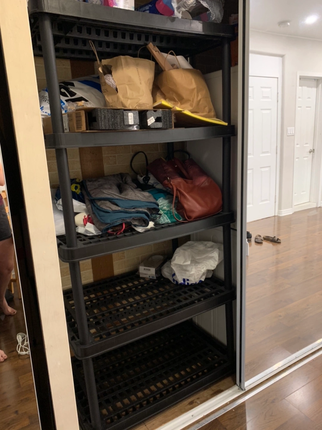 Plastic shelving unit in black. Useful in a closet or as garage storage.