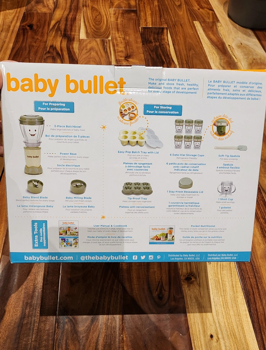 The Original Baby Bullet Complete Baby Care System is a 20 piece set that helps you make healthy, delicious, all-natural baby food that is perfect for every stage of development. Turn family dinner into baby's dinner, make an entire weeks worth of healthy all-natural baby food...in less than 5 minutes! Includes date-dial storage cups that are refrigerator and freezer friendly. Non toxic plastic - BPA Free.