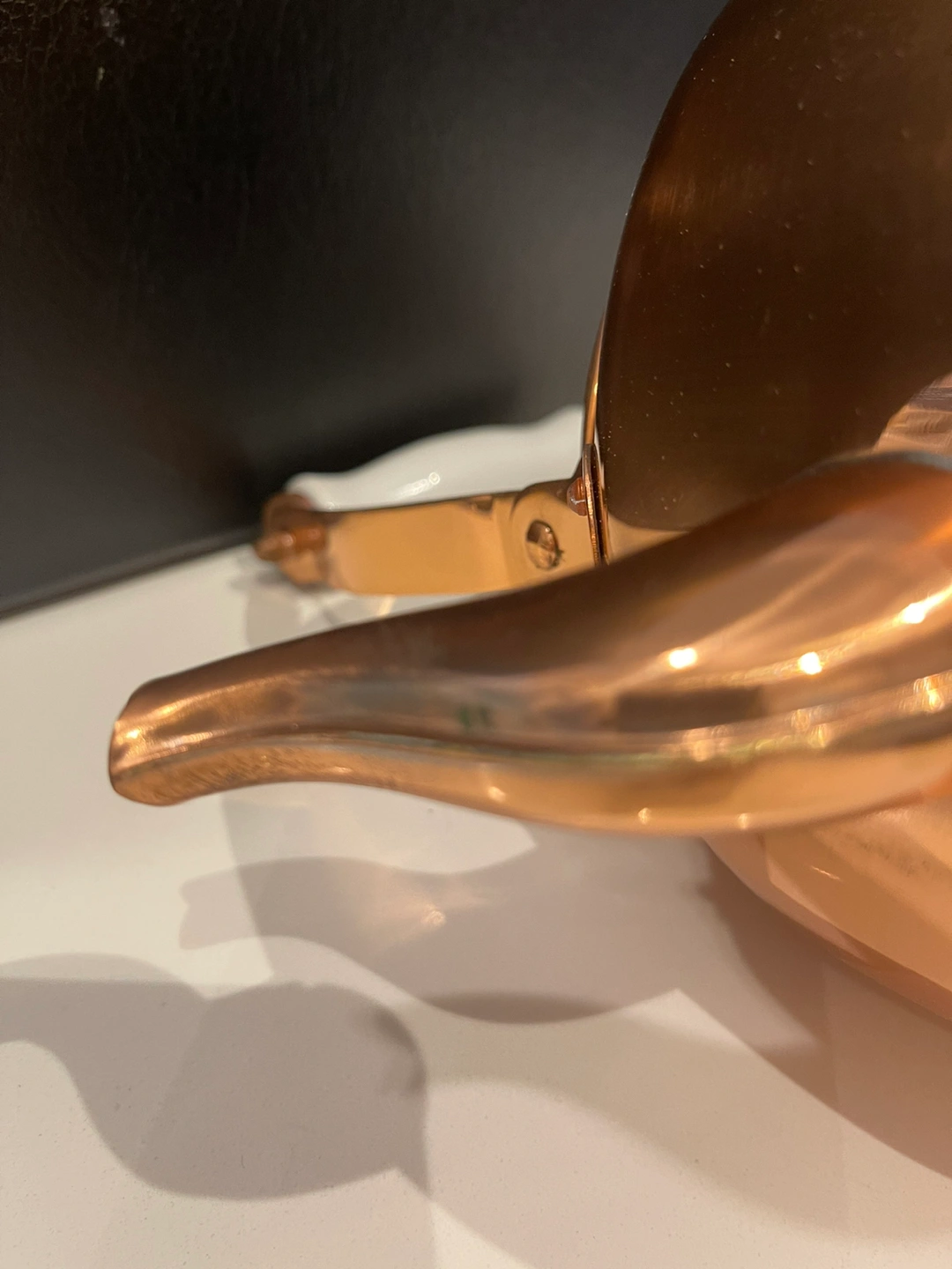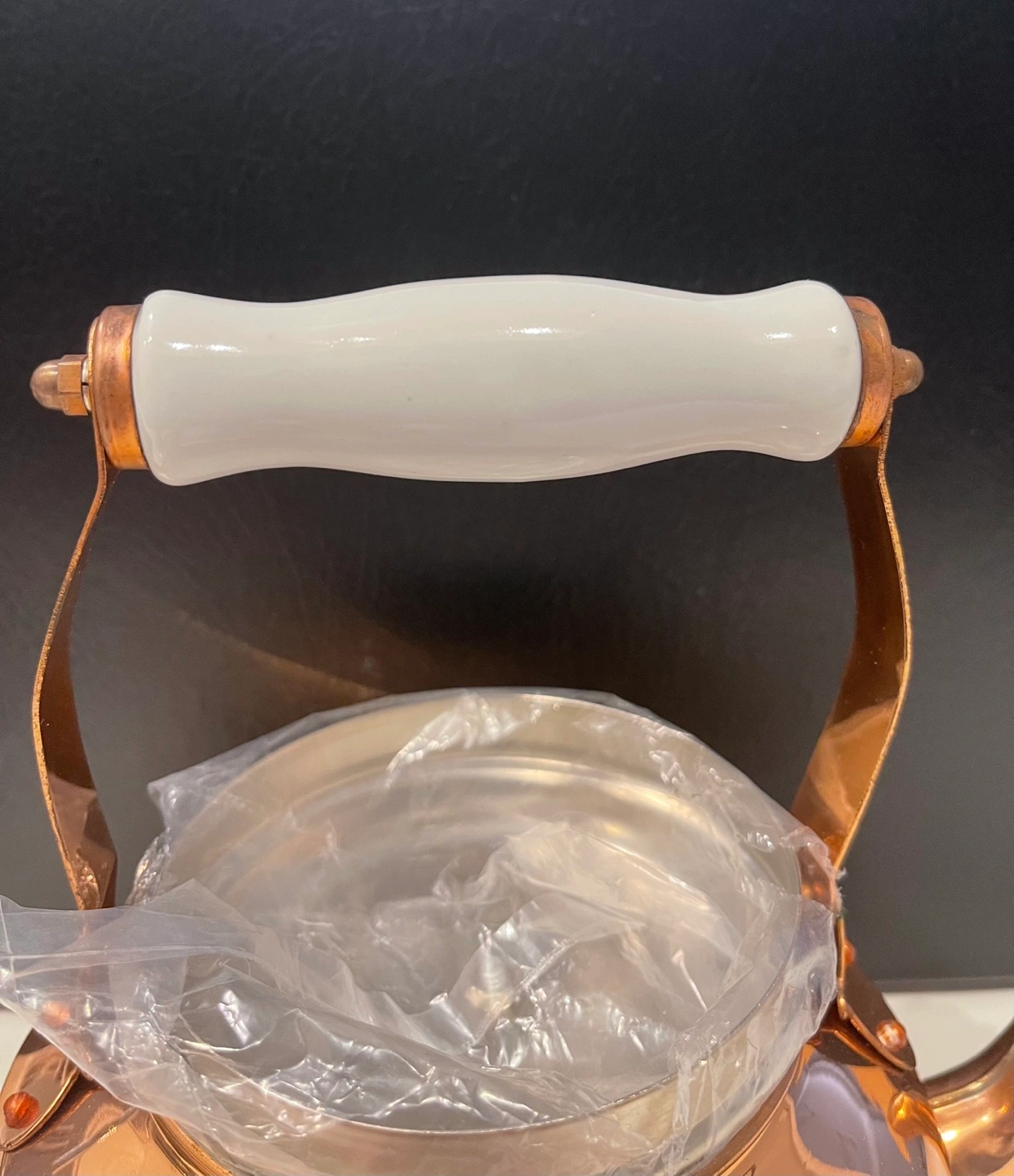 Copper Tea kettle with decorative ceramic trivet / warmer. Brand new in box , never used but the copper on the handle has become discoloured as as has the spout as shown in pictures. This is great for everyday use or can be used as a decorative item that compliments today’s modern trend towards copper accents in the kitchen .