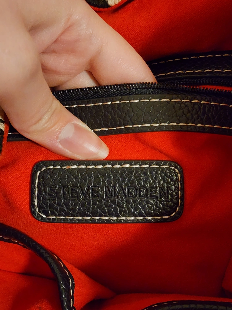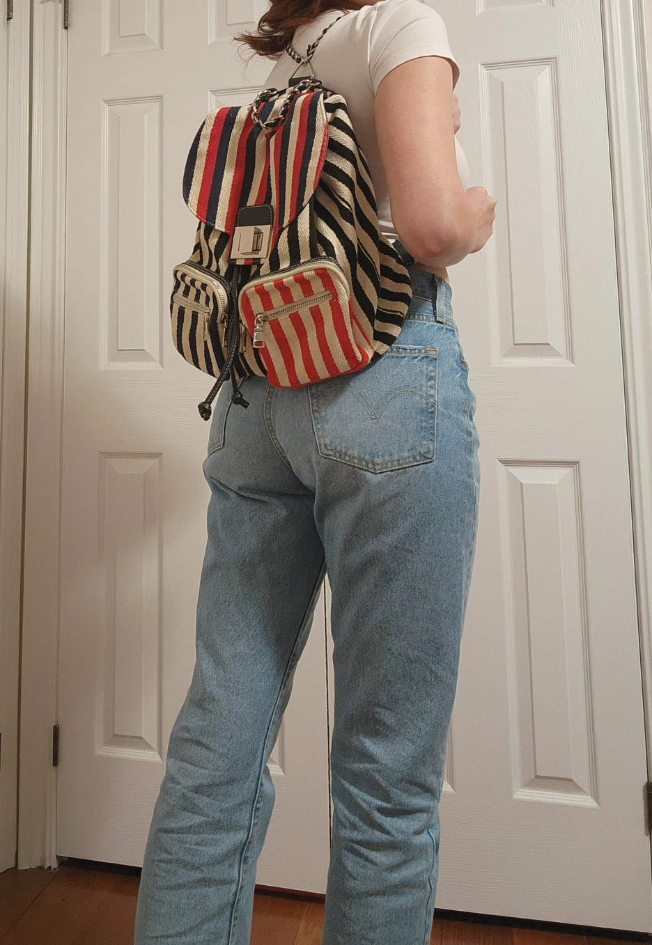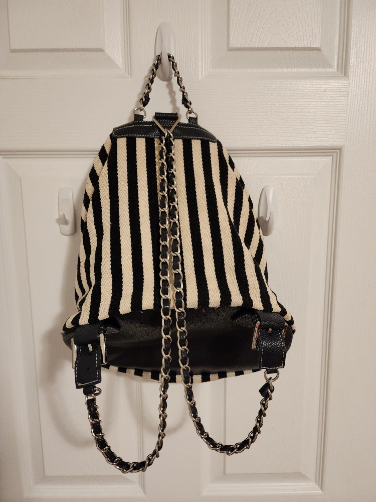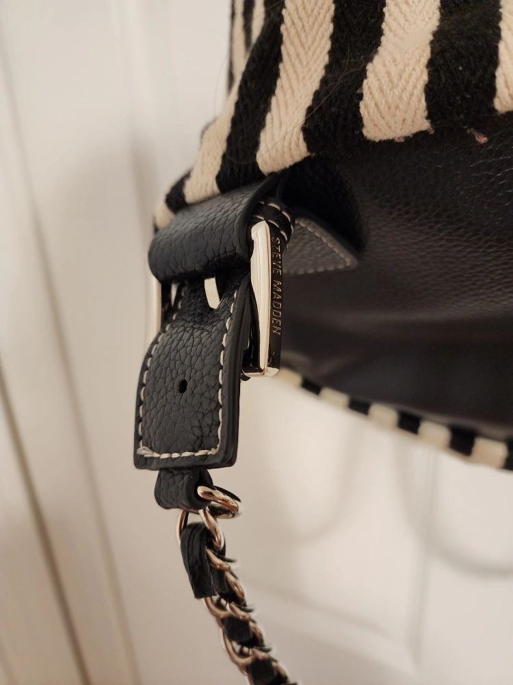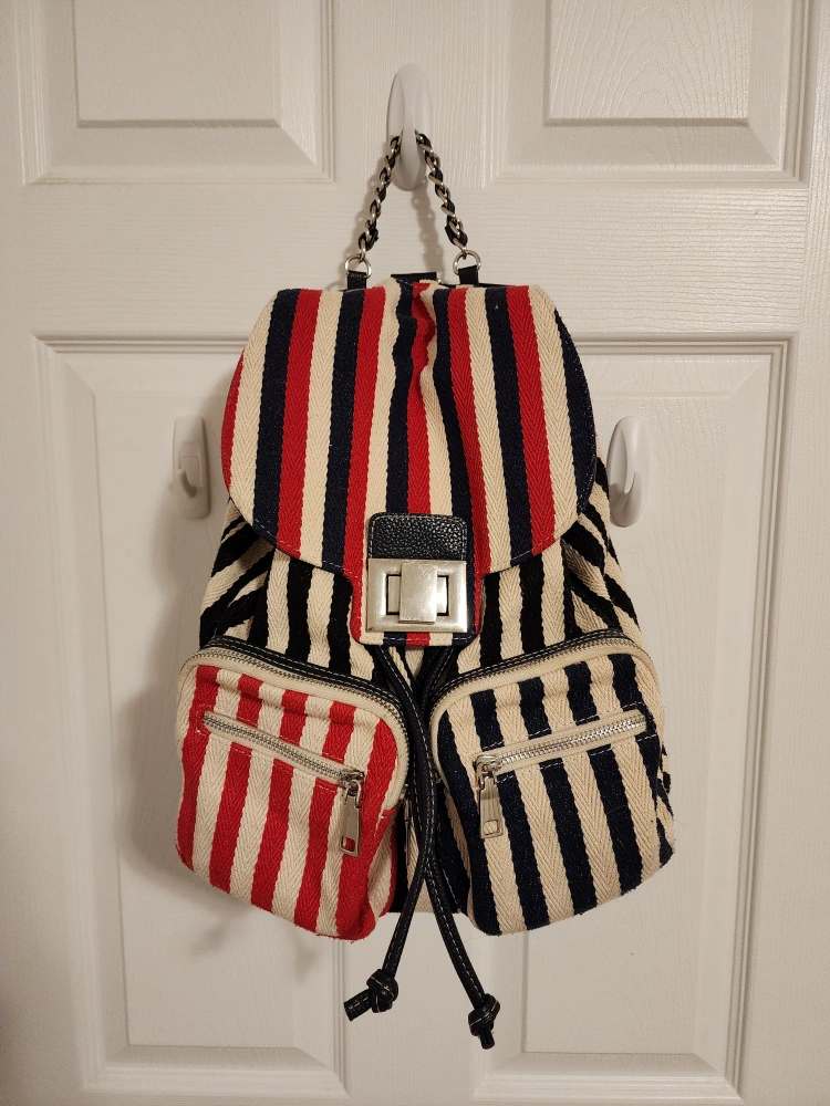 This Steve Madden tri-striped drawstring bag is a favourite of mine (much loved) :) It's in amazing condition despite some scratches on the metal buckle as shown in the pictures. The body is made with a blend of cotton and polyester, and the trim and bottom of the bag with PU (faux leather).