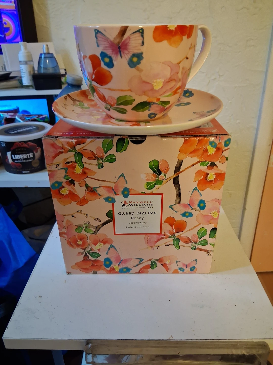Beautiful Maxwell Williams tea cup and saucer set designed by Gabby Malpas. Features a lovely 'Japonica Joy' floral and butterfly design. This set is perfect for enjoying a relaxing cup of tea.