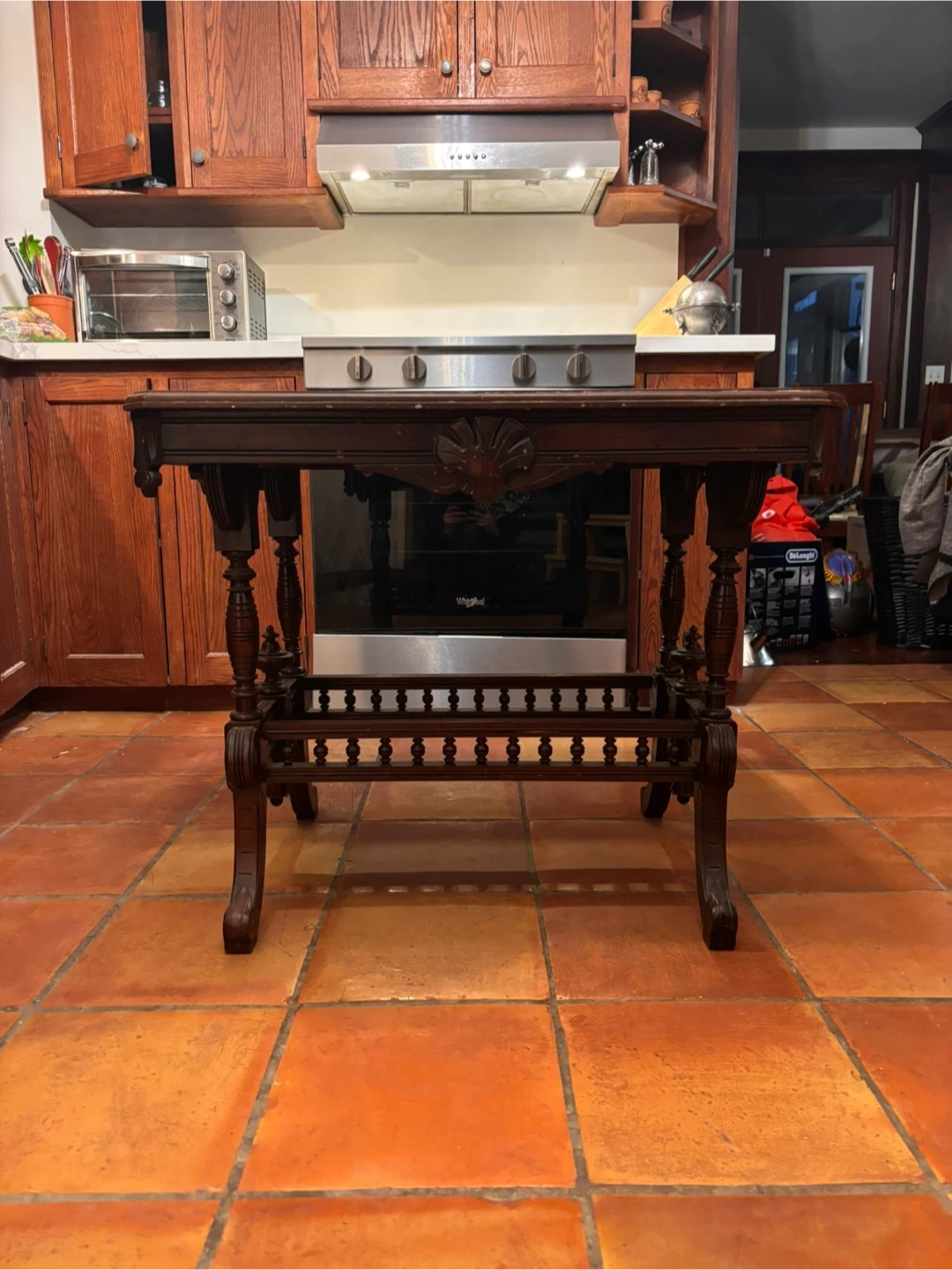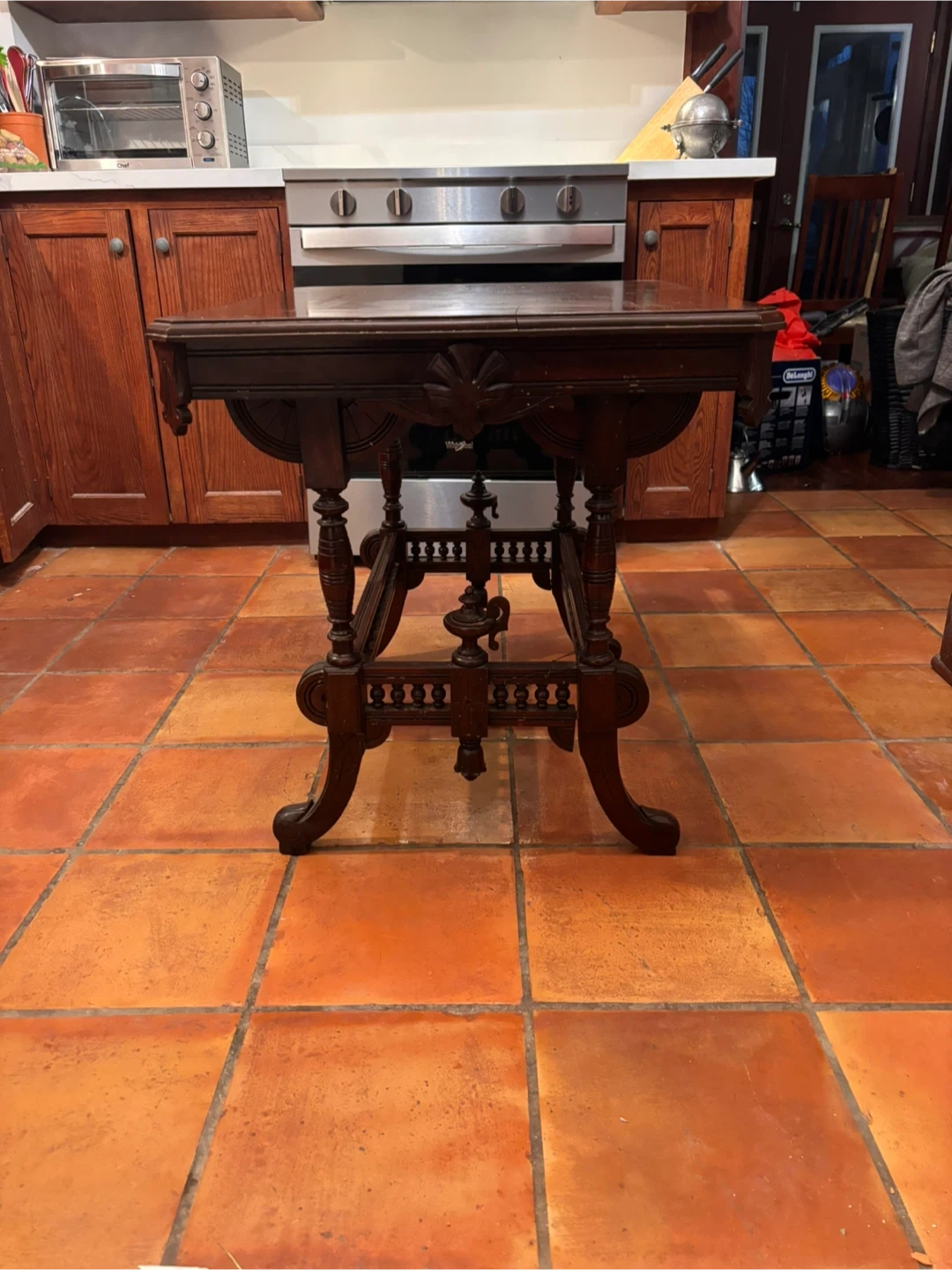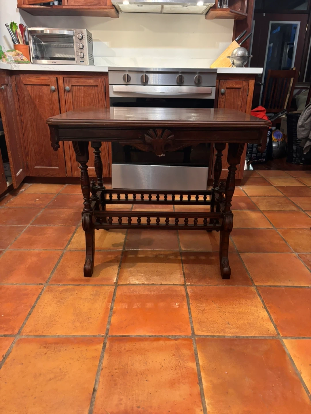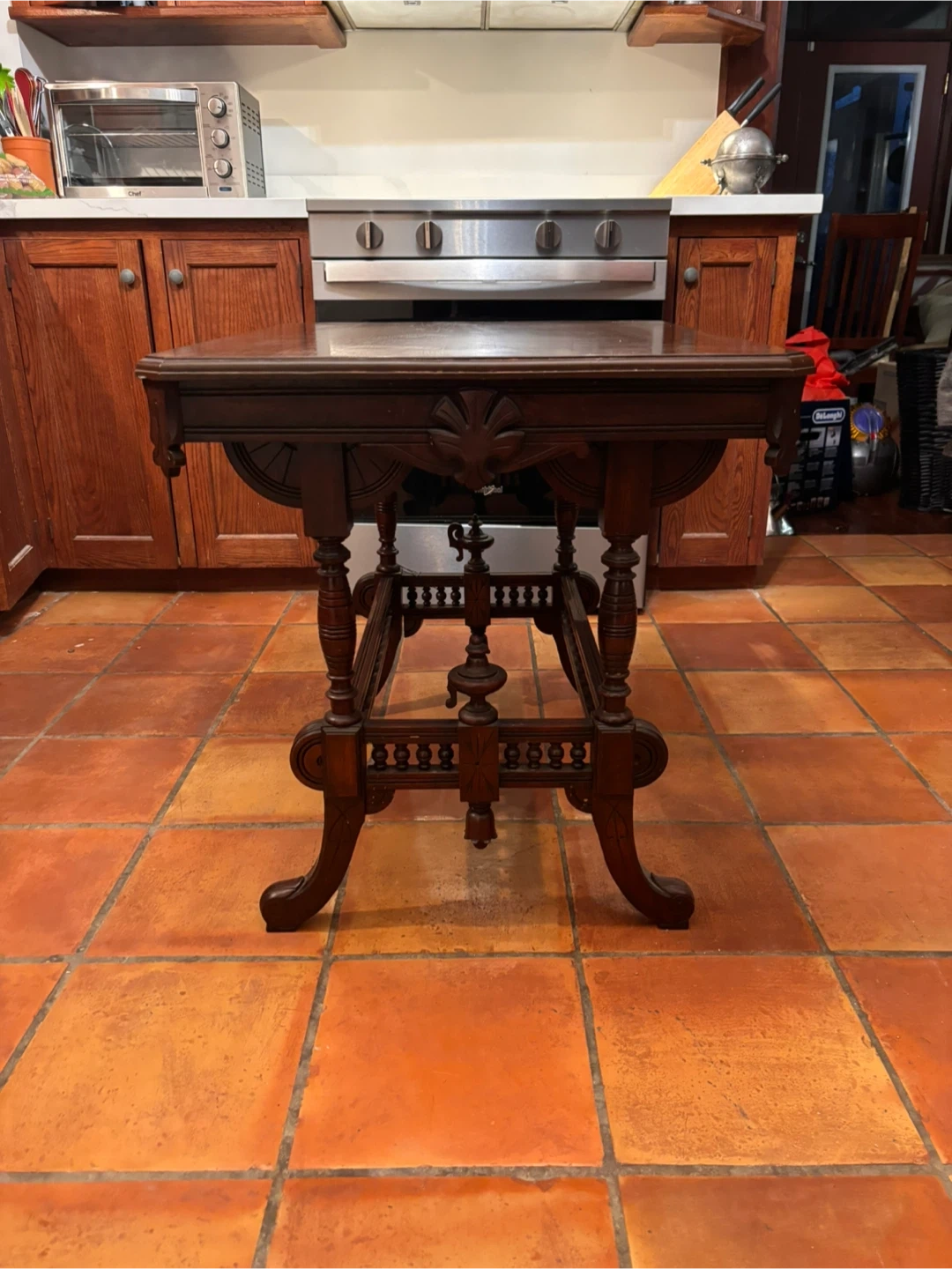 $350 or best offer - Beautiful antique Victorian-era mahogany parlor table with stunning carved details and turned spindle base. The craftsmanship on this piece is exceptional, featuring hand-turned legs, decorative stretcher rails, and a carved center medallion that give it classic Victorian character.