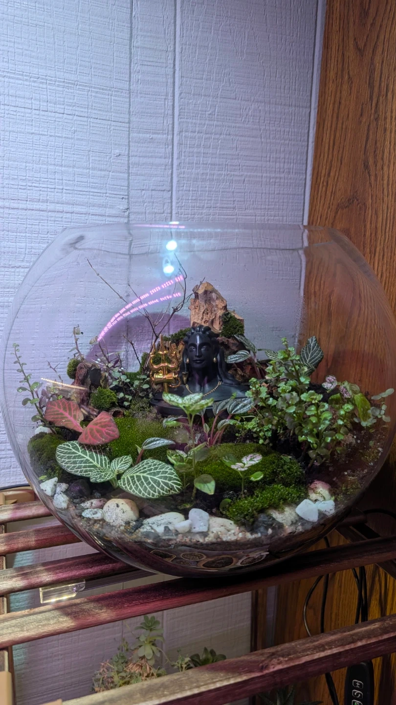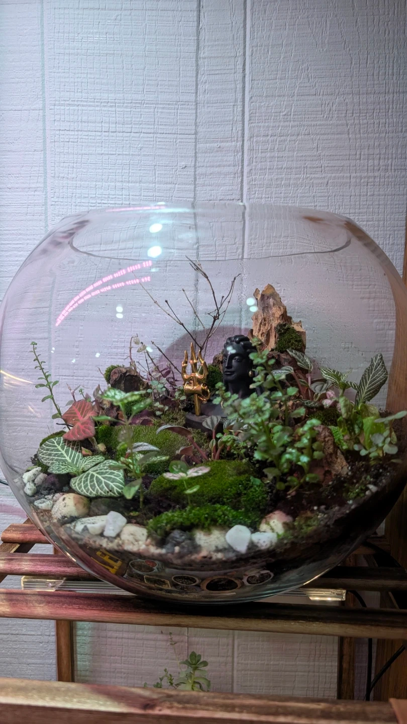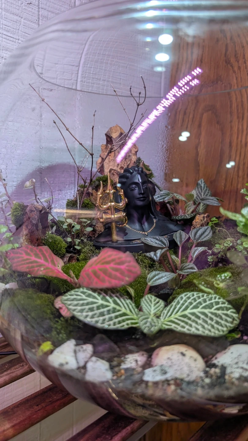 A unique terrarium featuring a statue of Lord Shiva aadi yogi. It includes various live plants like Fittonia and moss, set in a large glass bowl. This piece adds a serene touch to any space.