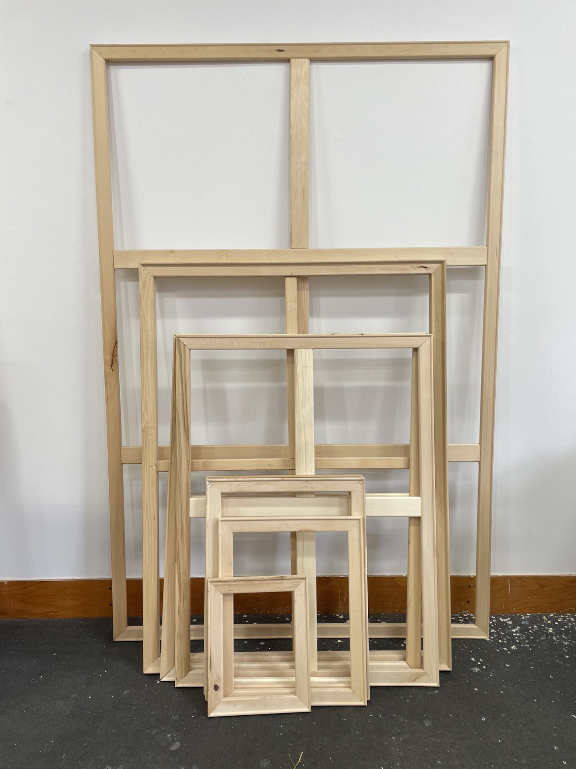 Wooden regular stretcher frames with incurved top surfaces to prevent contact between canvas and frame and provide better tension. Made in Canada by Apollon-Gotrick.