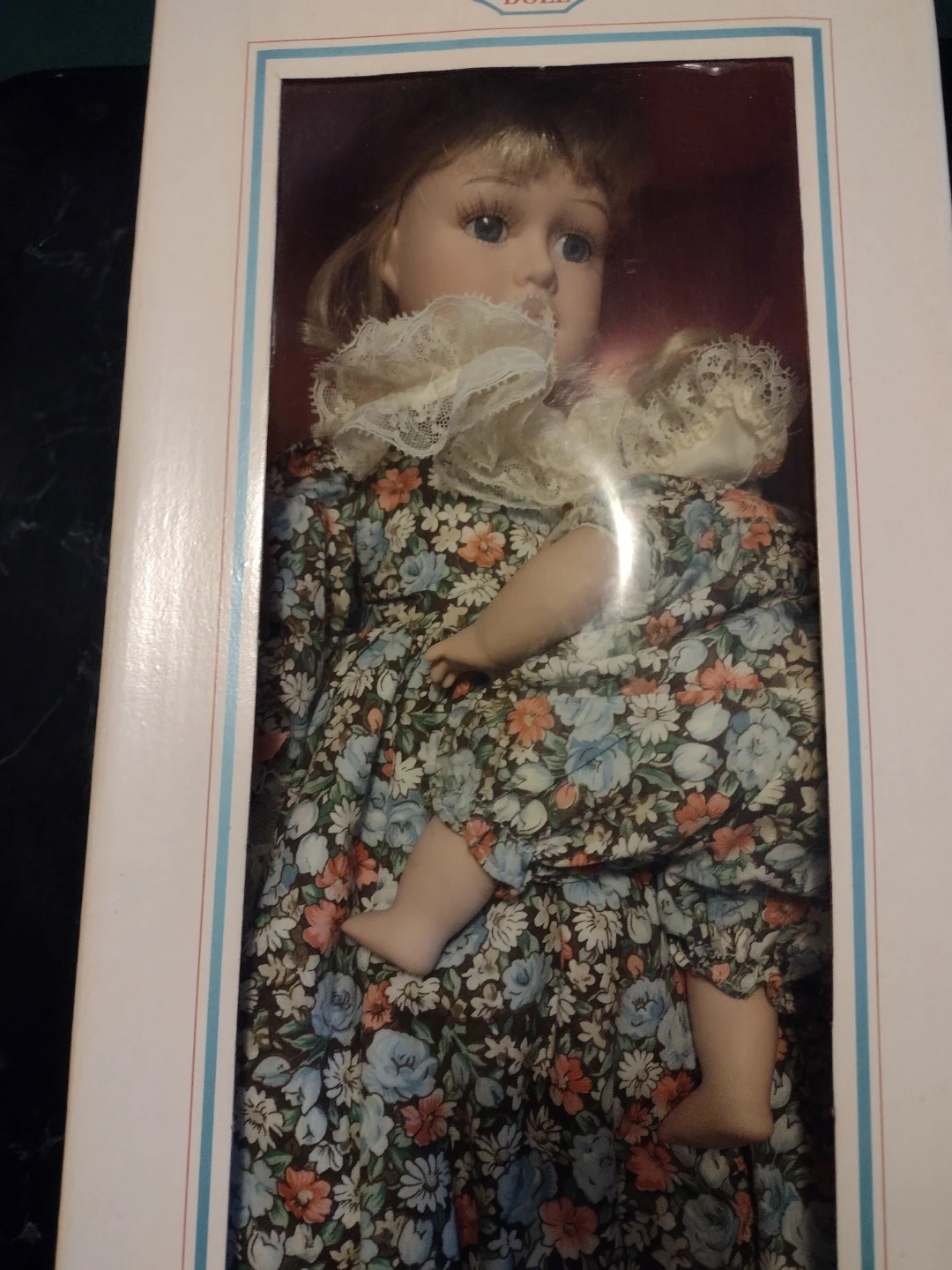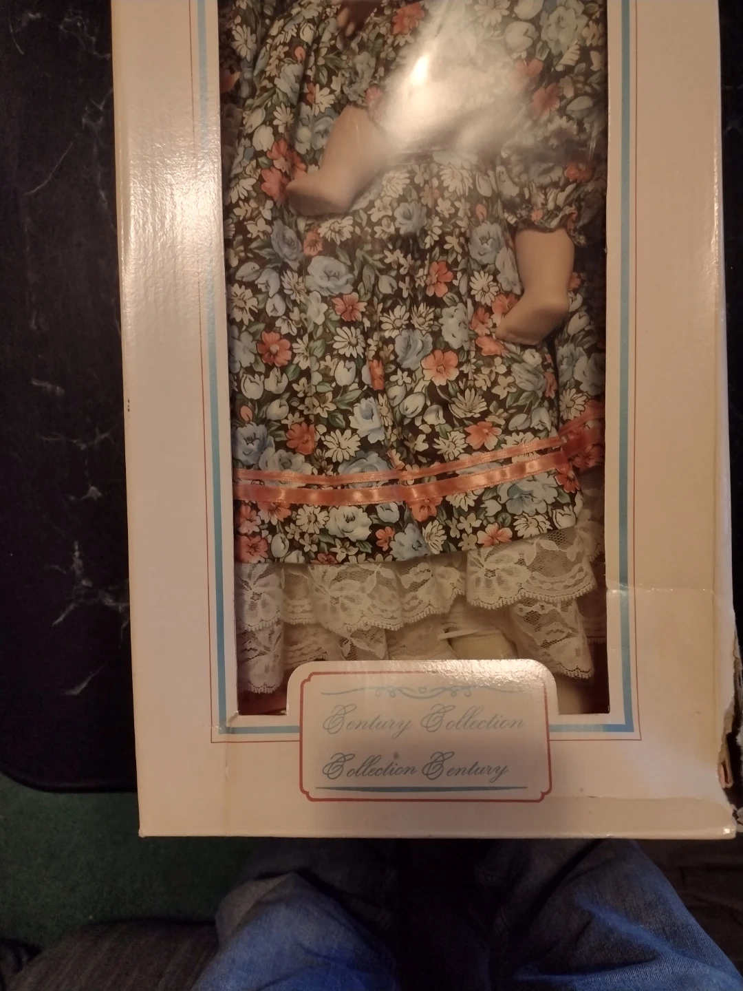 This is a "Genuine Porcelain Doll" from the Century Collection. It's beautifully hand-painted and dressed in a floral patterned dress with lace accents. Recommended for ages 8 and up.