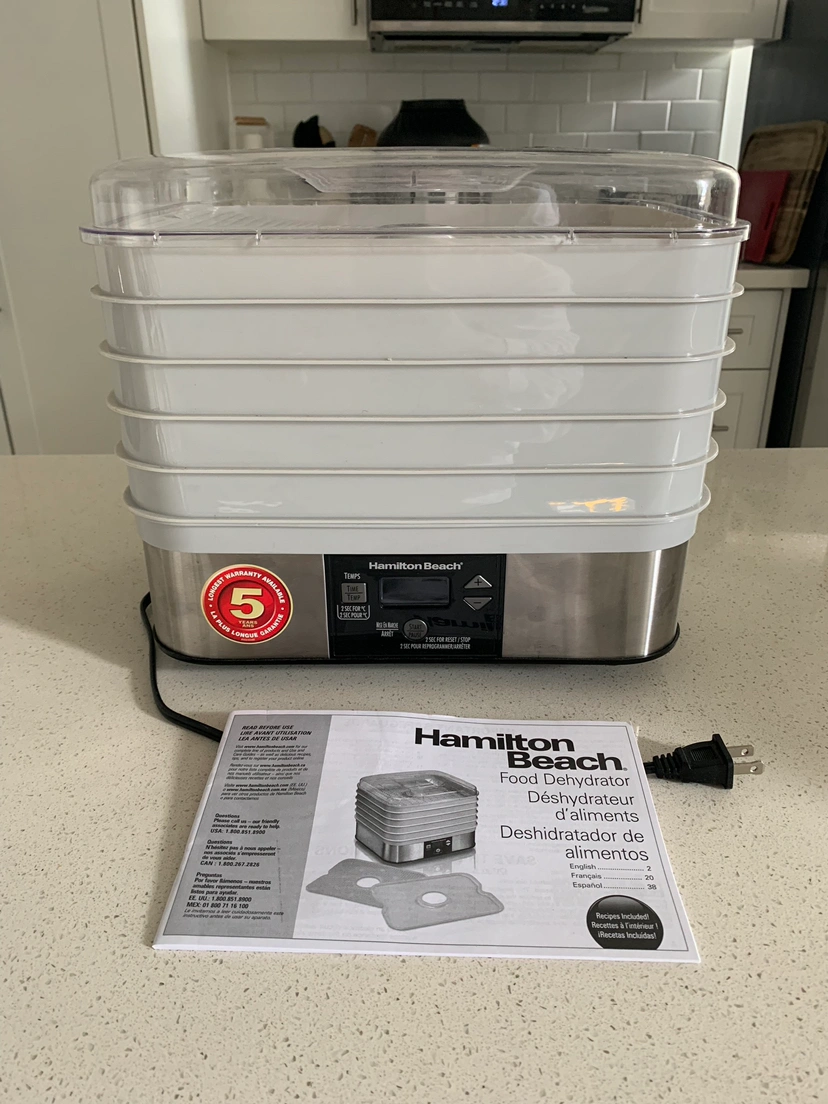 Hamilton Beach food dehydrator (model: 32100C). Five drying trays, with additional sheets for herbs and fruit rolls. User guide with recipes and drying times is included.