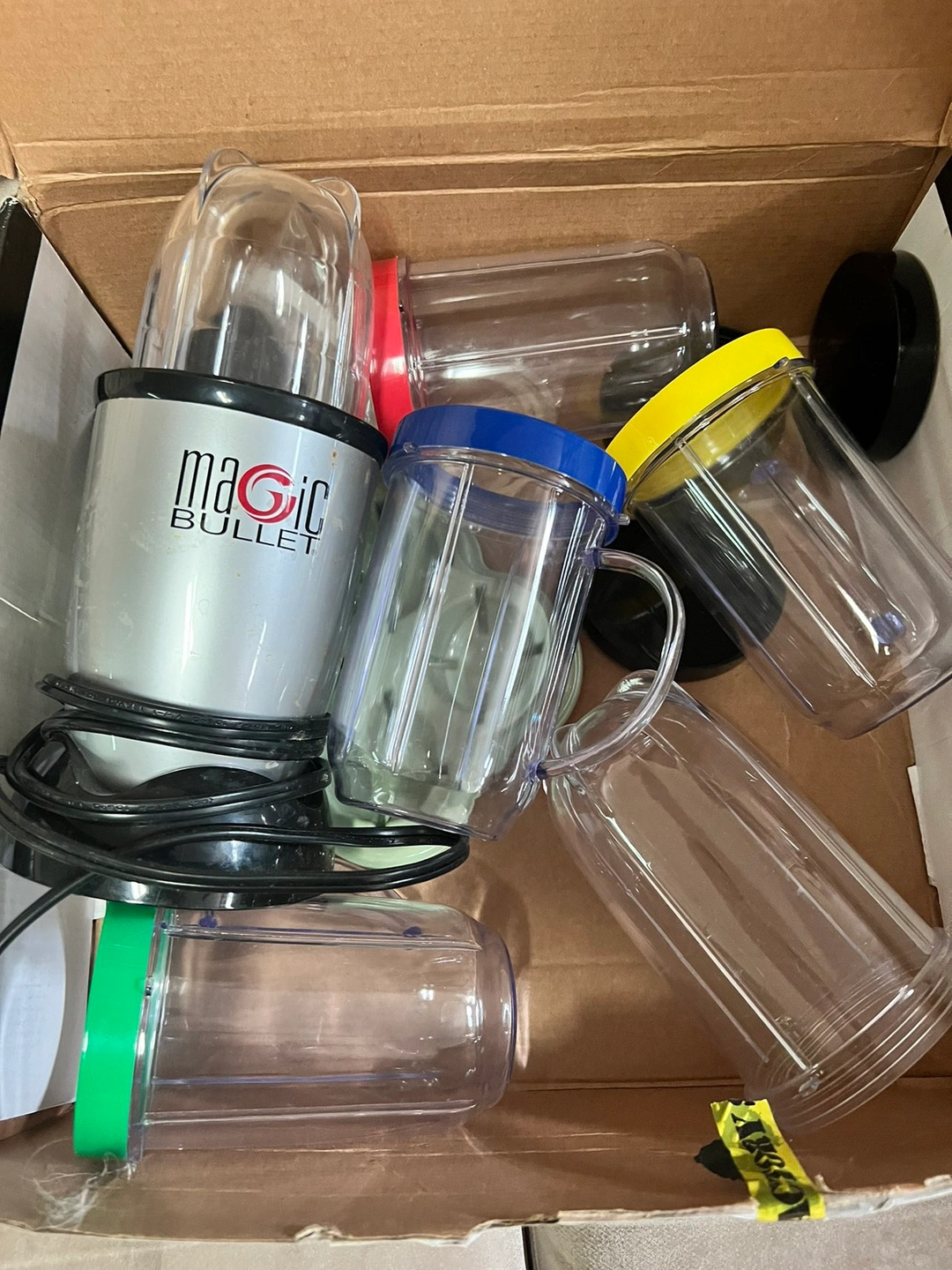 Magic Bullet mixer system with four mugs (four coloured rings), two mixer container sizes for large and small items, two blade styles and a tray to freeze small amounts for home made baby food.