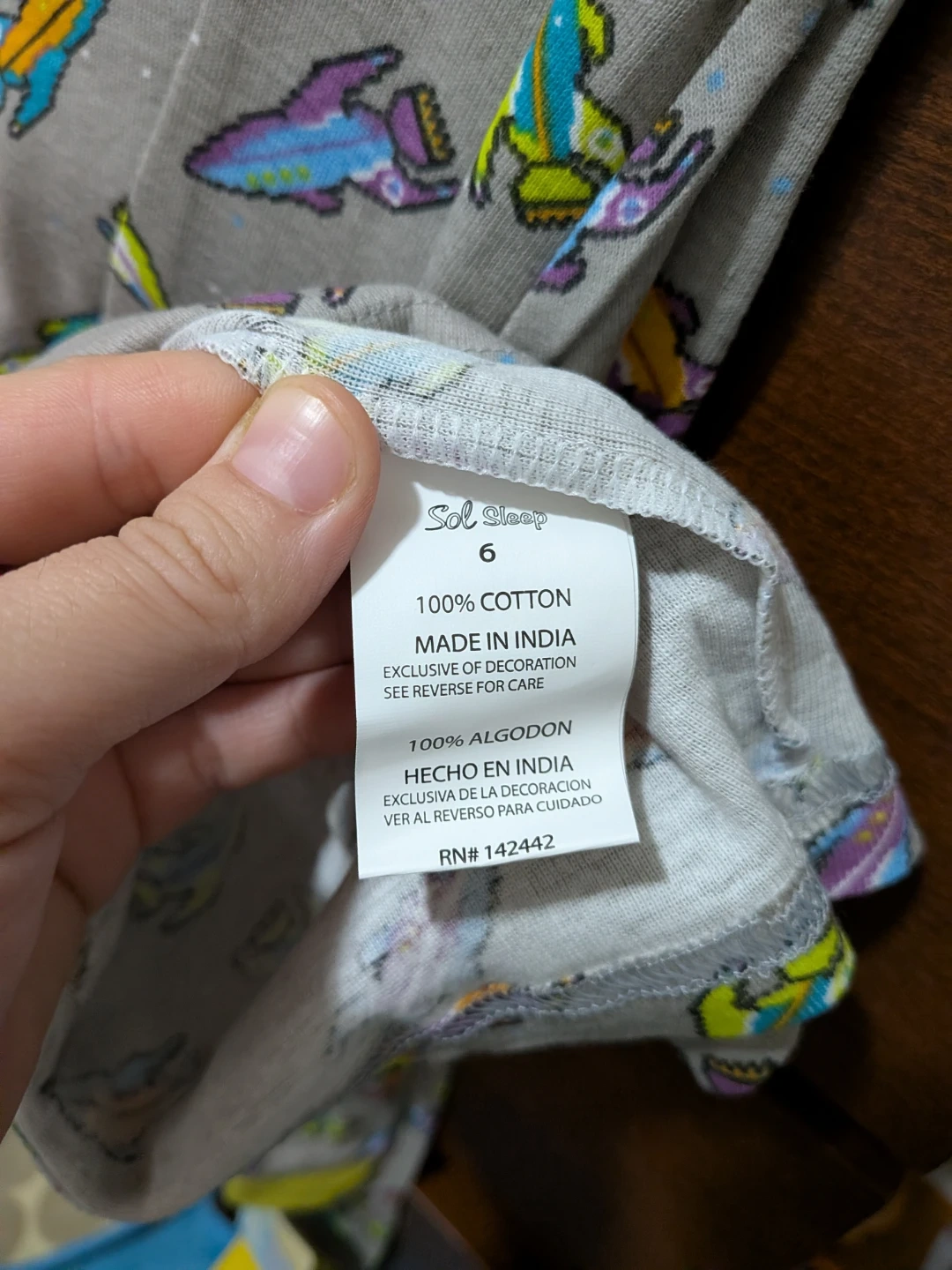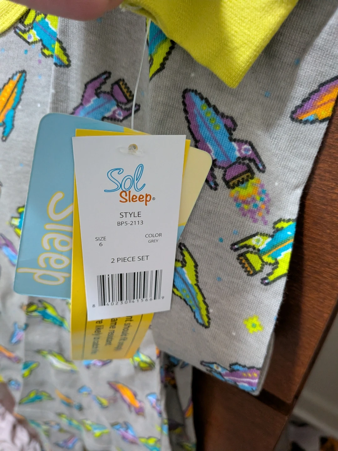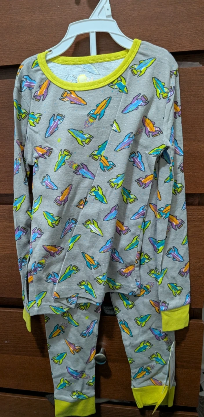 Sol Sleep 2-piece pajama set for kids. Features a grey background with a pixelated rocket ship print. 100% cotton material. Made in India. It's a size 6.