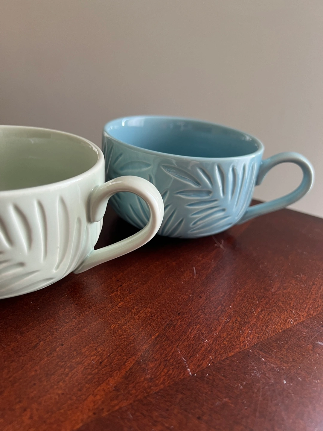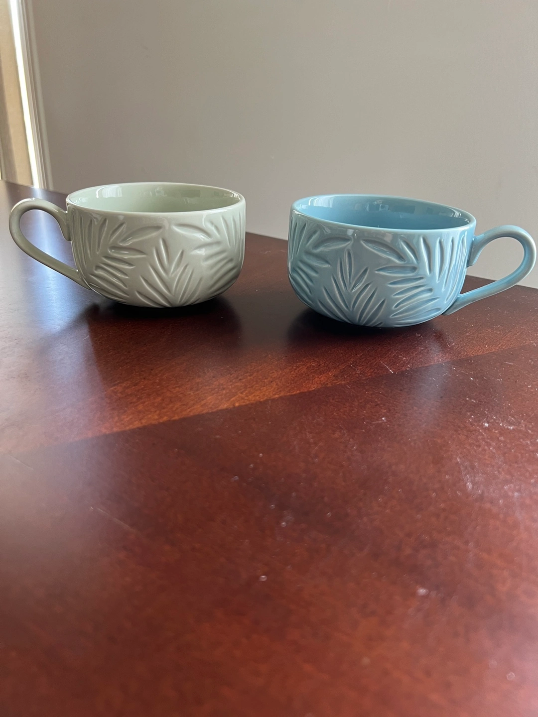 Mint green and light blue with really pretty leaf detailing.