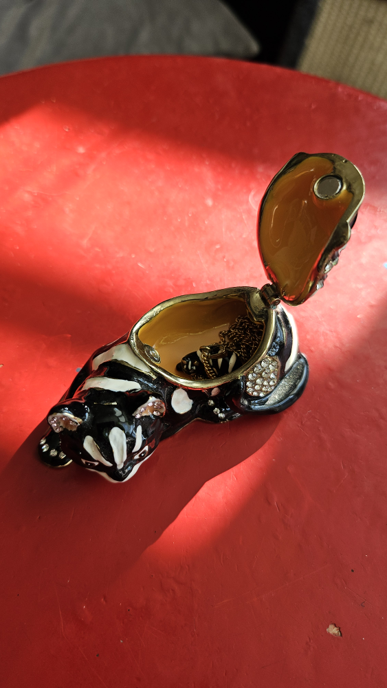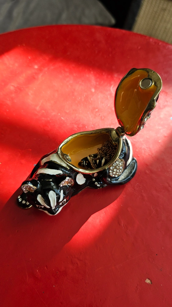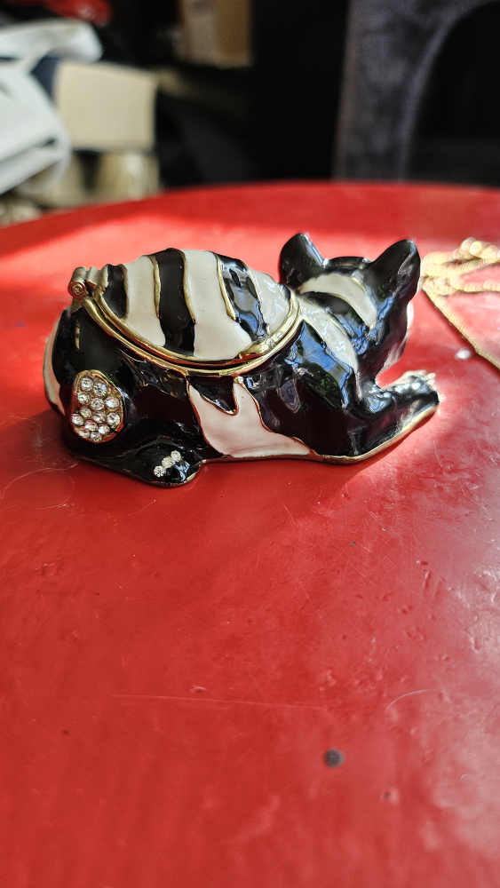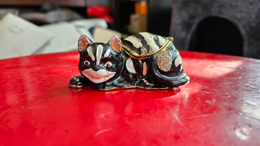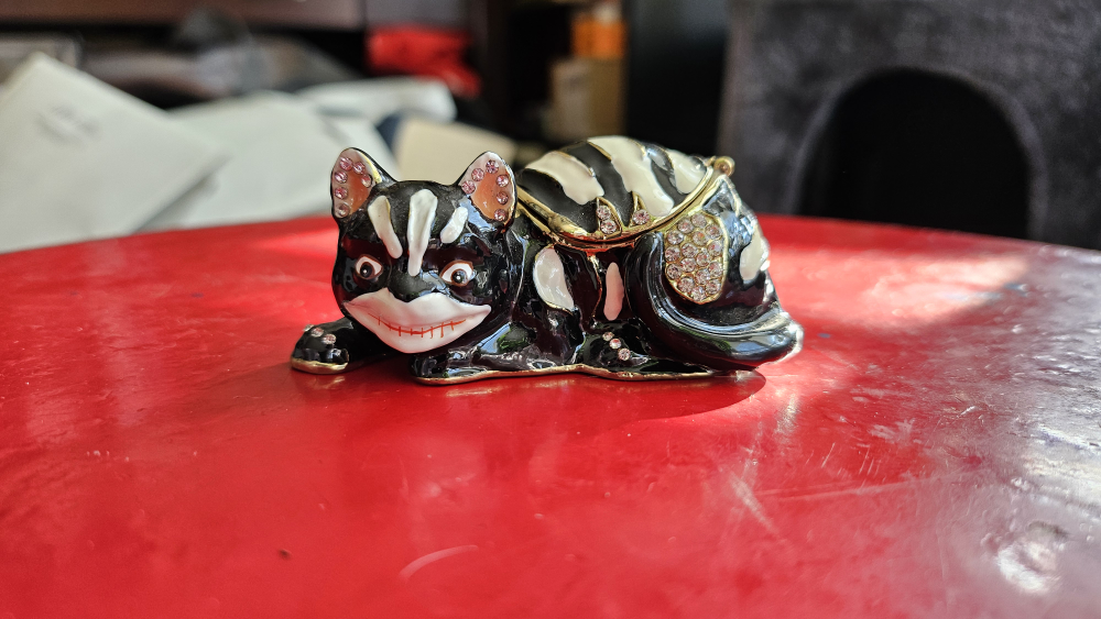 Cheshire Cat ornament with hidden compartment containing matching chain. See all photos. Miniature Chesire Cat on a gold chain. The box is gone but the item is new. Figurine is exquisite: bedazzled and bejeweled and grinning like mad! Beautiful little item. Available for pick-up near Oakwood Village.