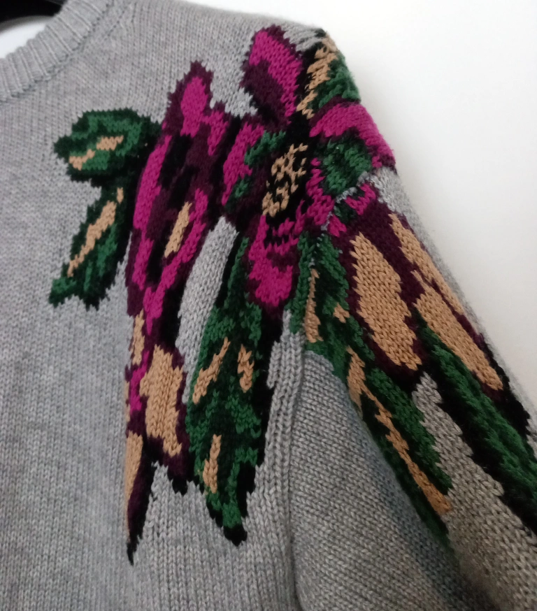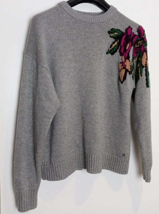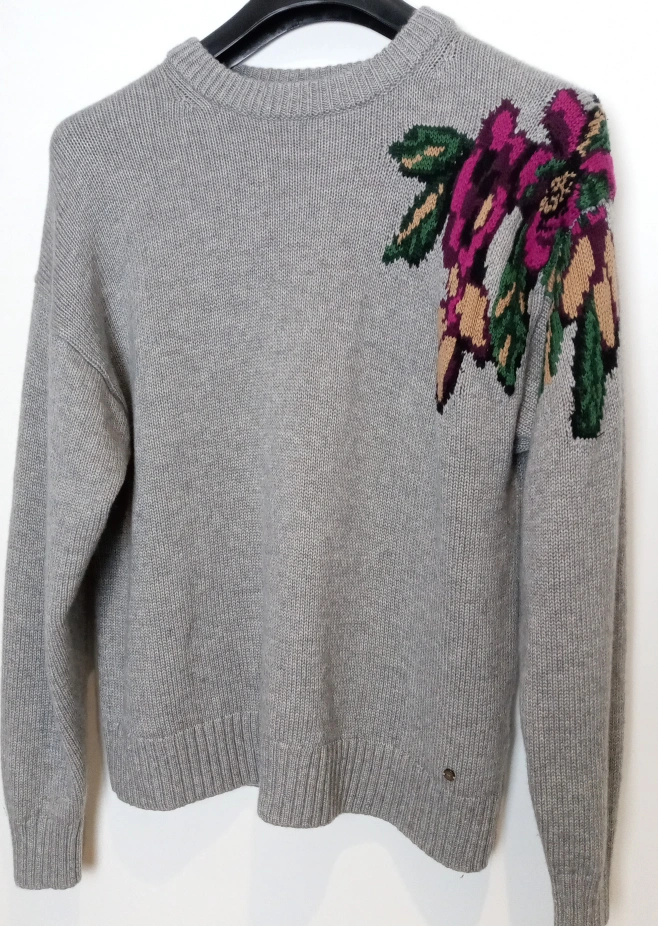 Grey sweater with flower embroidery on left shoulder. Worn only a few times. Size M. Like new.
