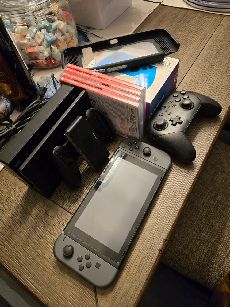Nintendo Switch in mint condition! Rarely used, as the nature of my job doesn't allow me to stay home for long period of time. Never been brought outside or trips. Screen protector applied since first use. Comes with 2 extra controllers, 4 games, sturdy case. No original box. Price is firm.