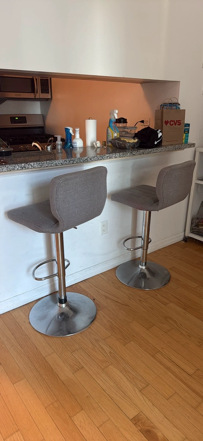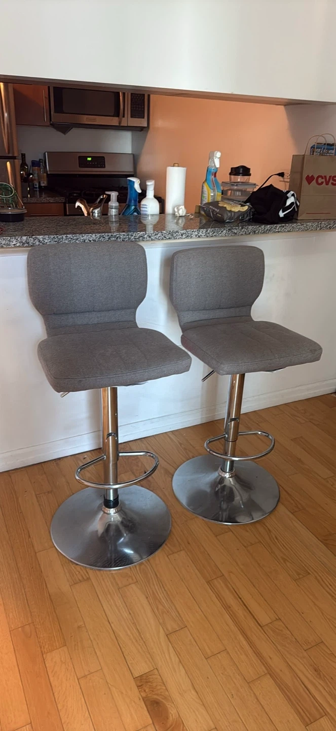 Set of two adjustable height bar stools. Gray fabric upholstery with chrome base and footrest. Swivel action for easy movement.