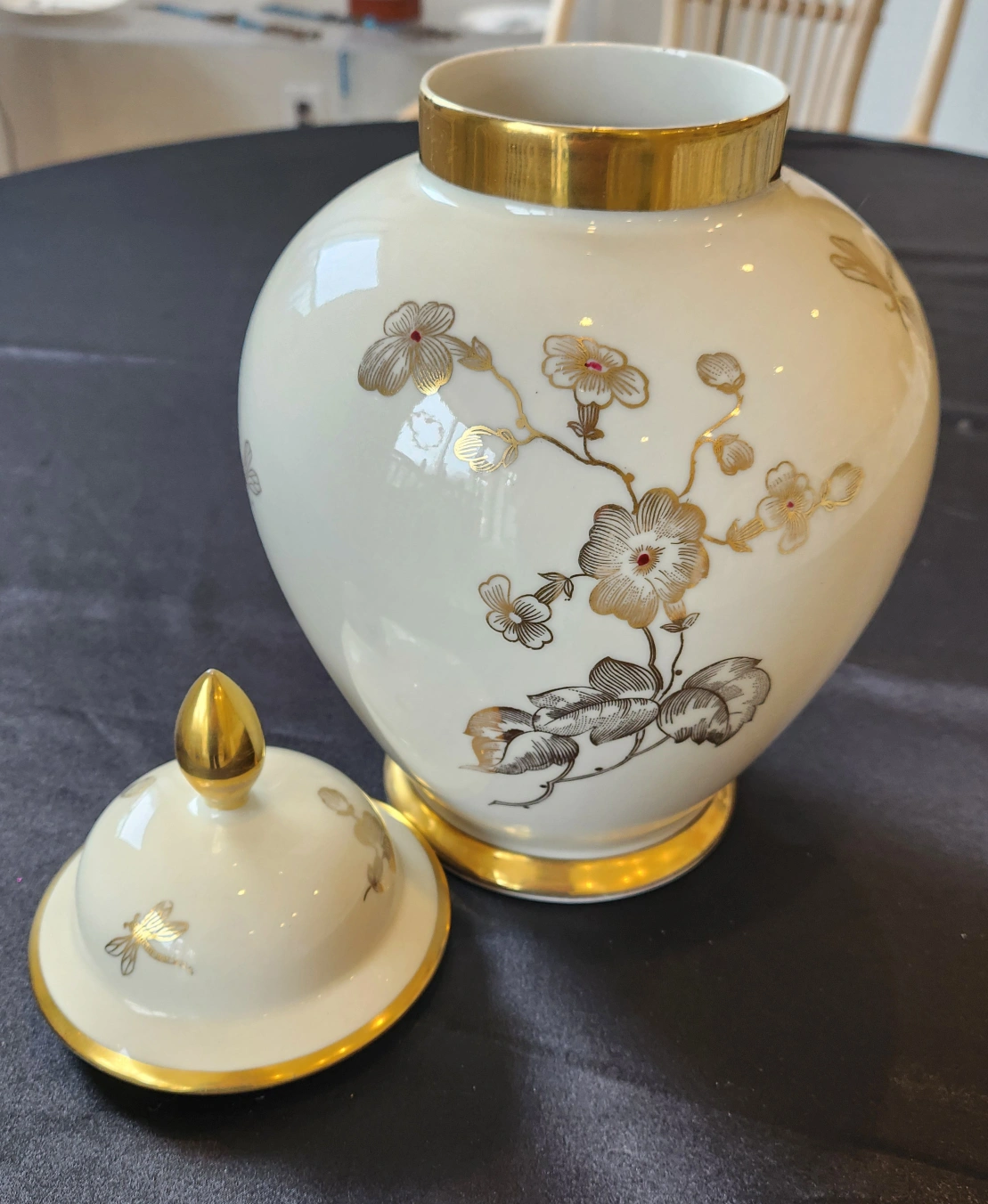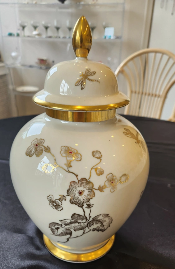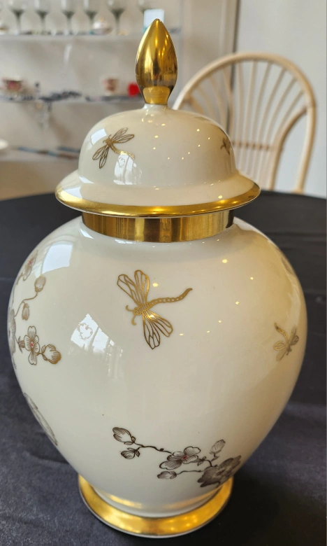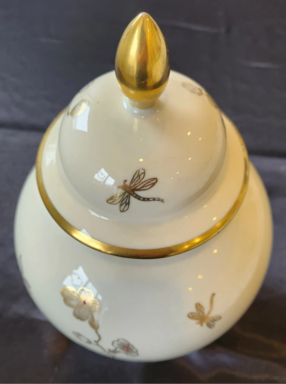 The lidded jar urn, is 12" tall.And is decorated with a delicate Apple blossoms, and Dragonflies.