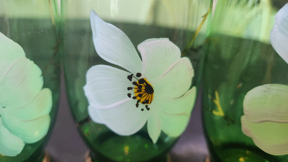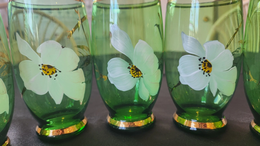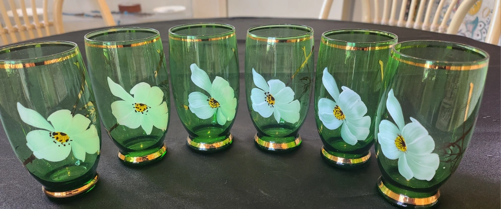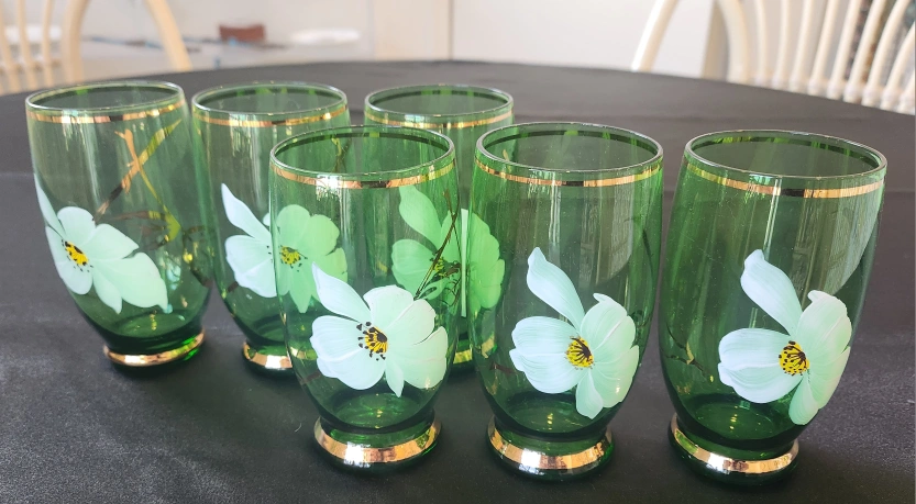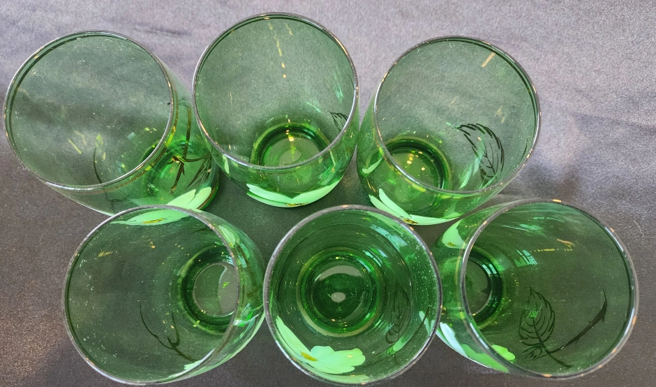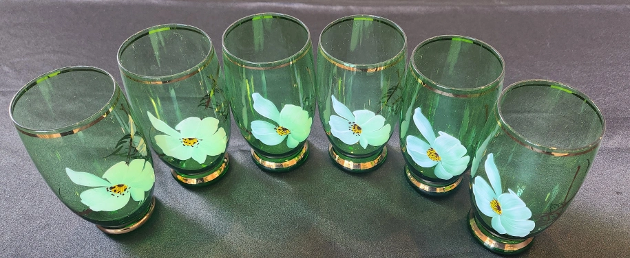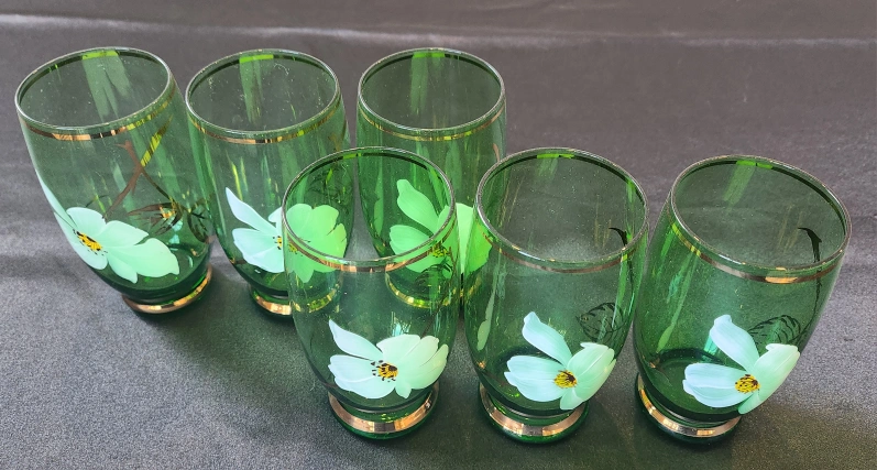 I am offering six beautiful green glass tumblers, made in Japan.