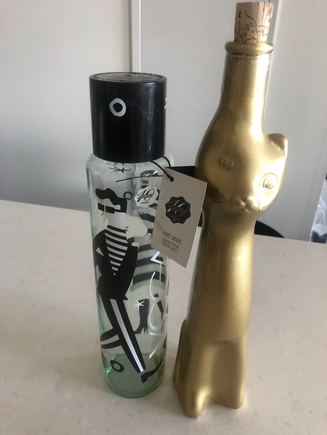 Vintage glass wine glass bottle (empty)and Voga 10th Anniversary wine glass bottle(empty). From my own collection; No chips or cracks.