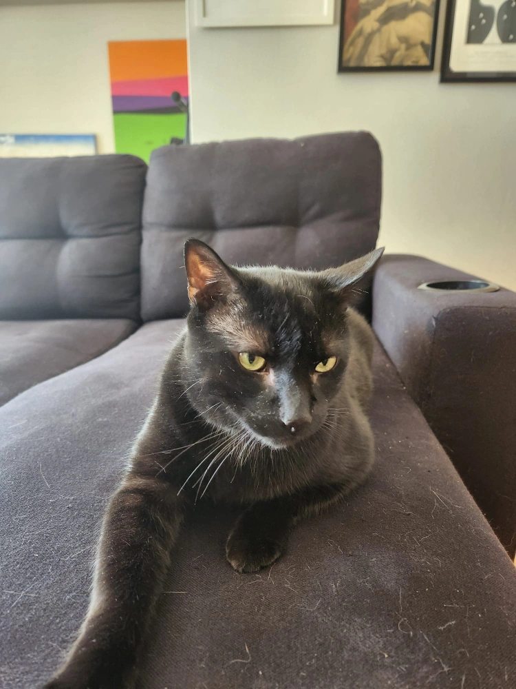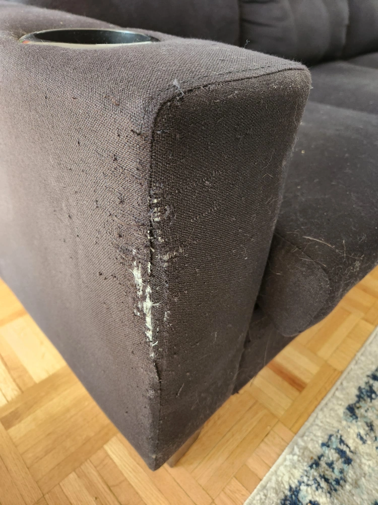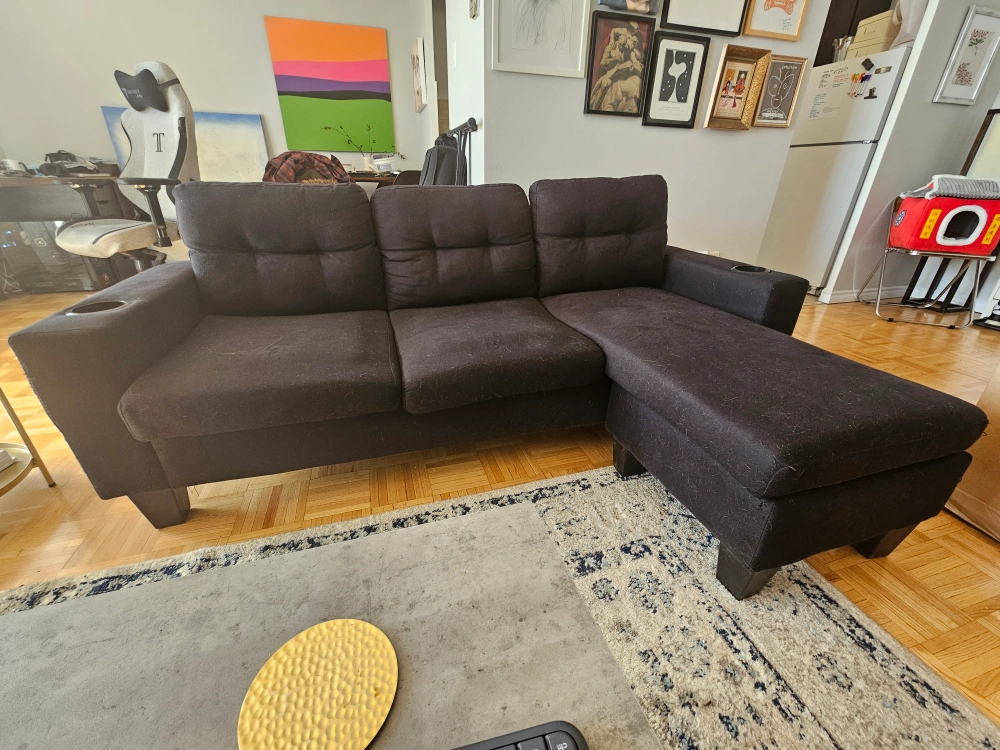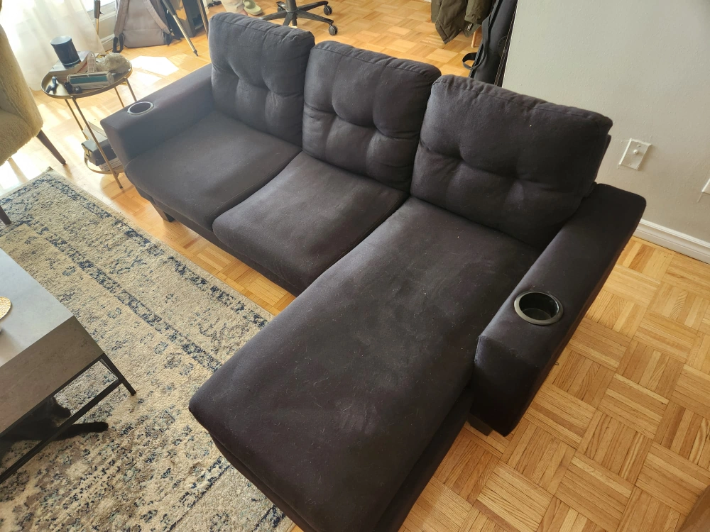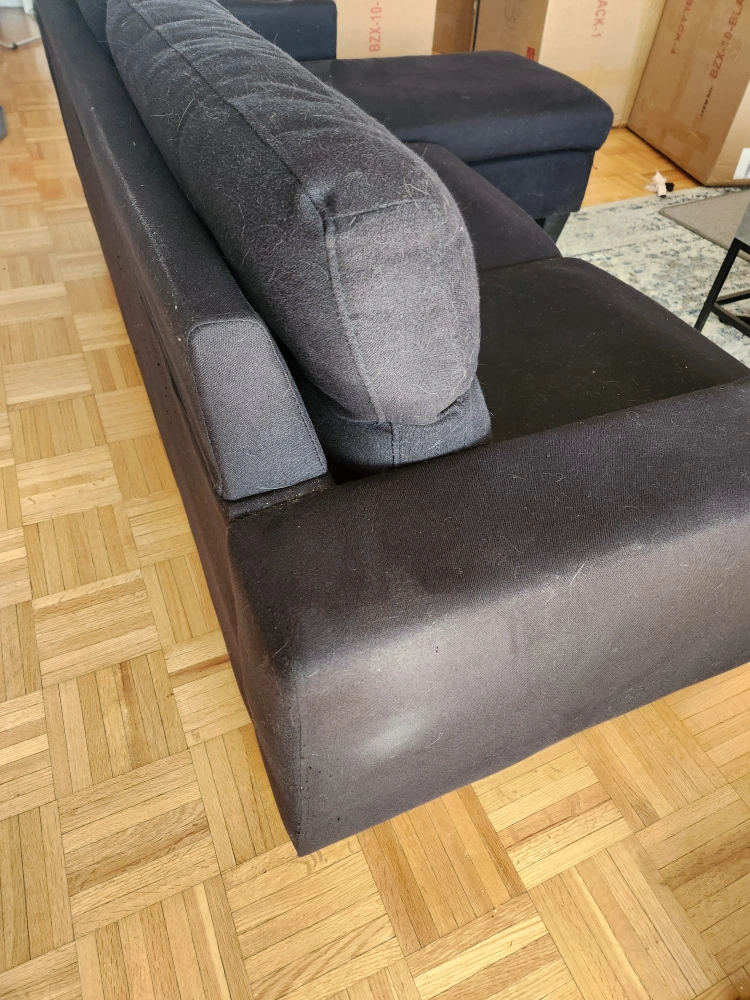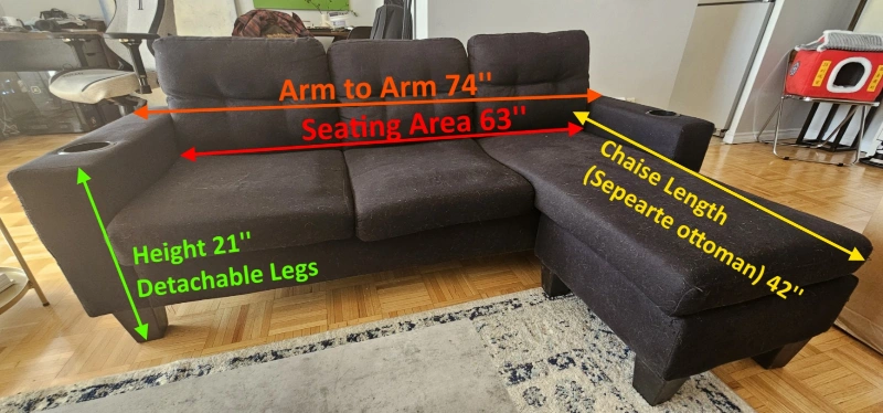 Great small little sofa with swappable ottoman/cushion so chaise can swap sides. Has some damage from cat scratches on front left-facing side.