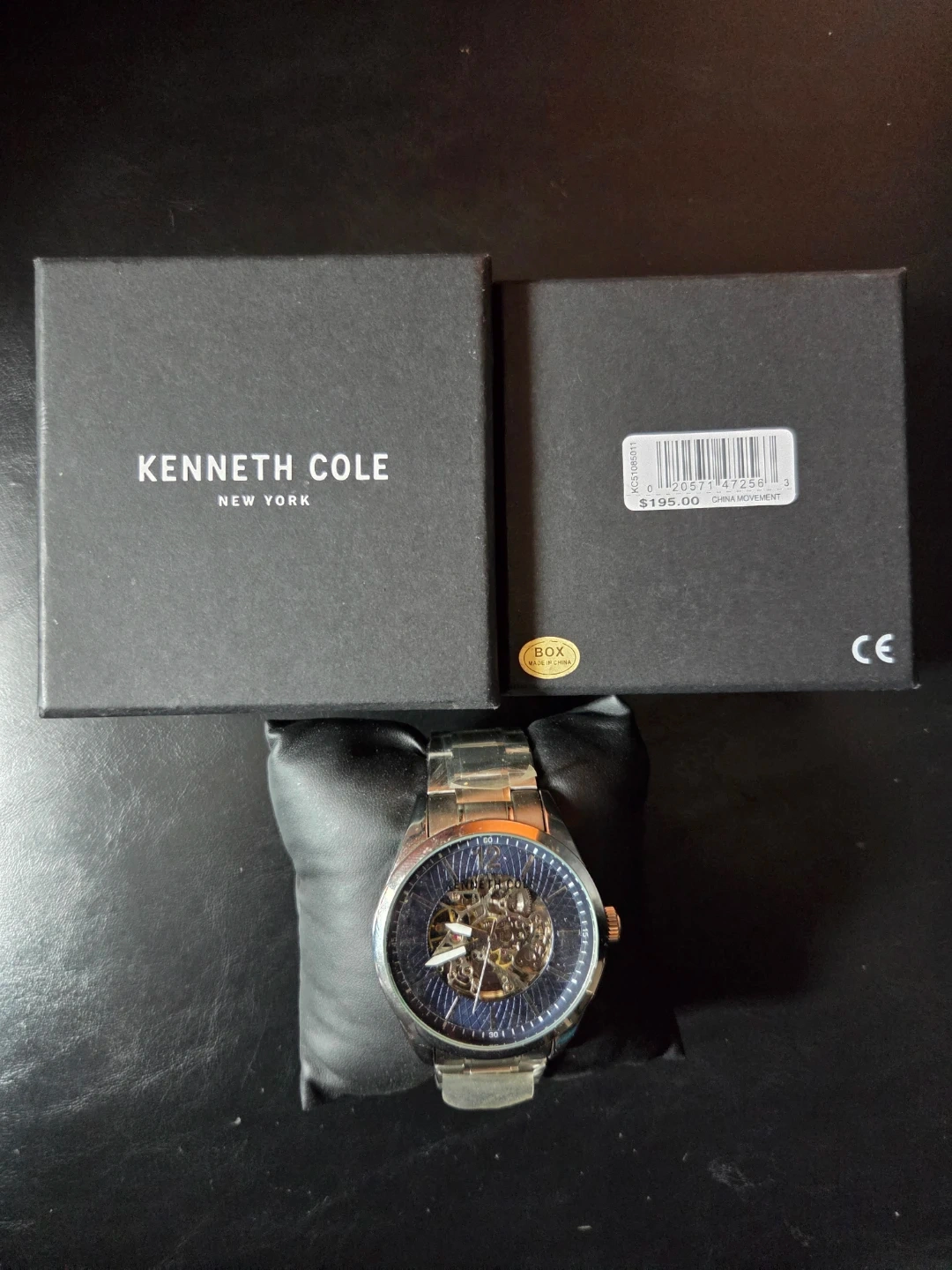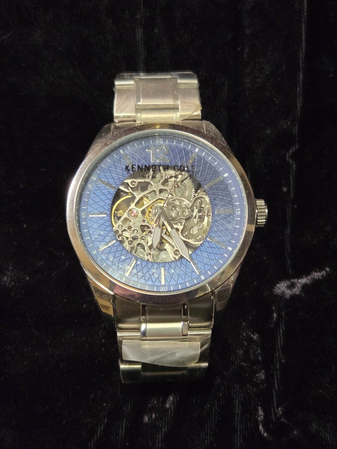 New - not worn - with box. Kenneth Cole New York automatic watch with a blue textured dial and skeleton movement. stainless steel band and case. Displays hours, minutes, and seconds.