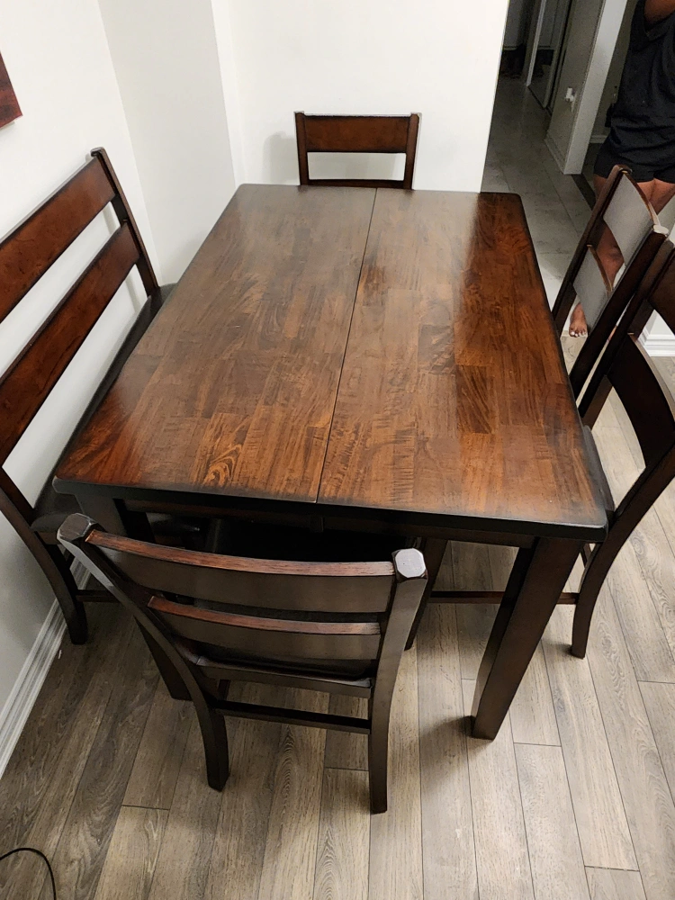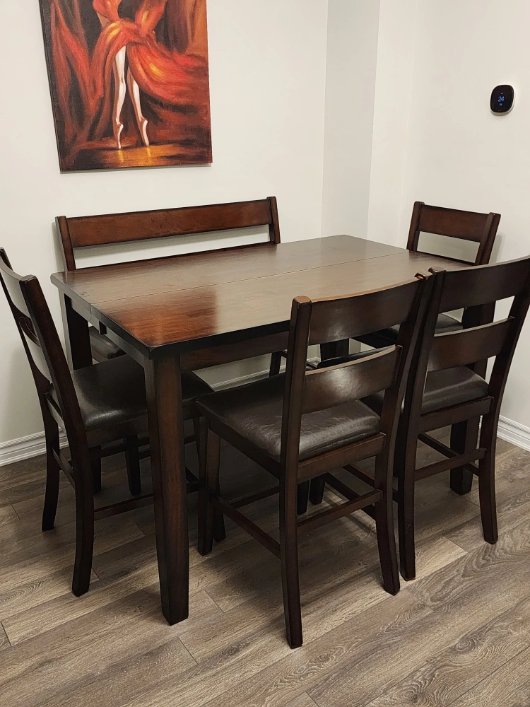 "$500.00"Solid wood dining table with bench has a leaf in the middle. Opens up pretty big, very solid. Heavy and seats are comfortable.
