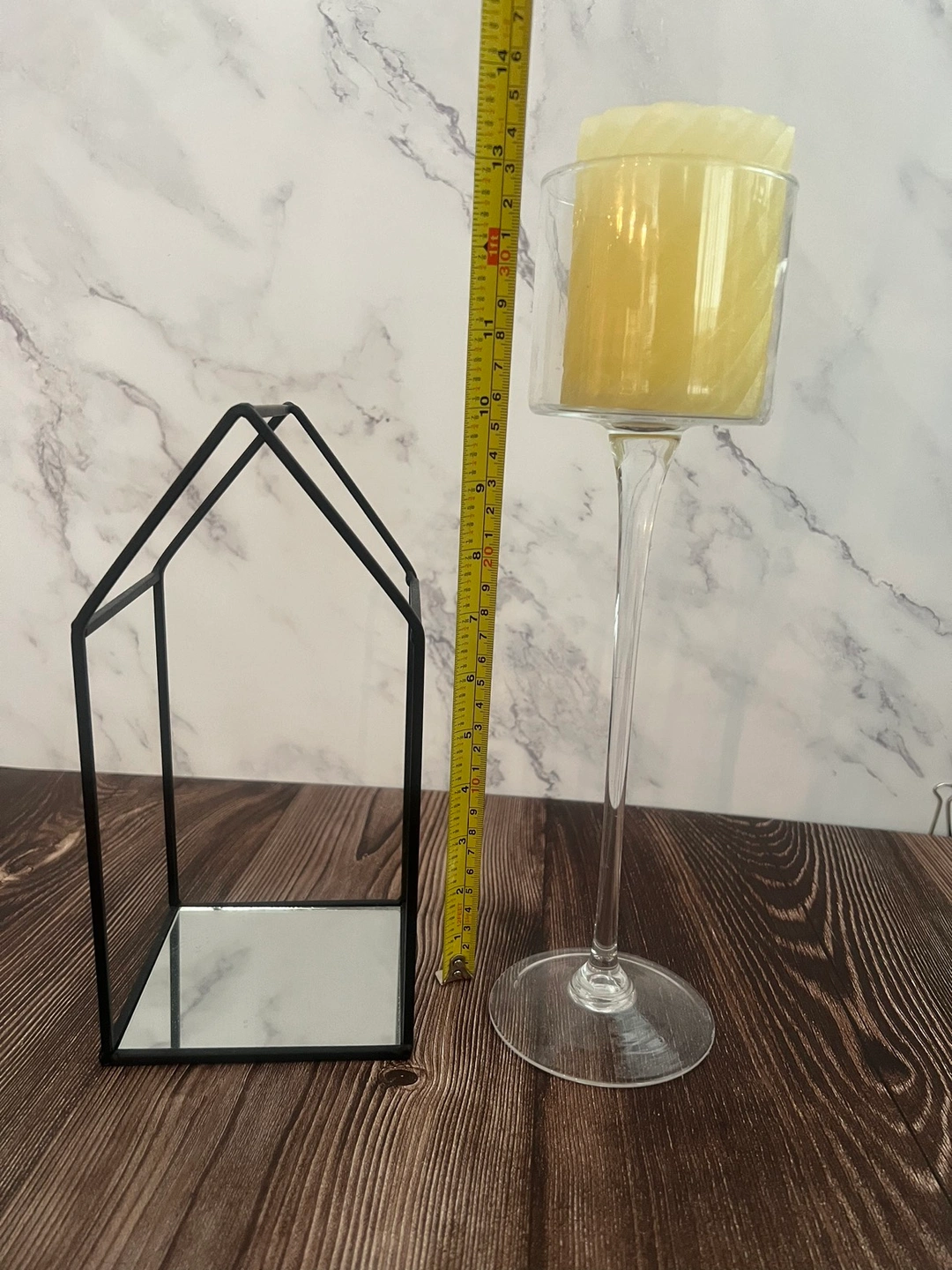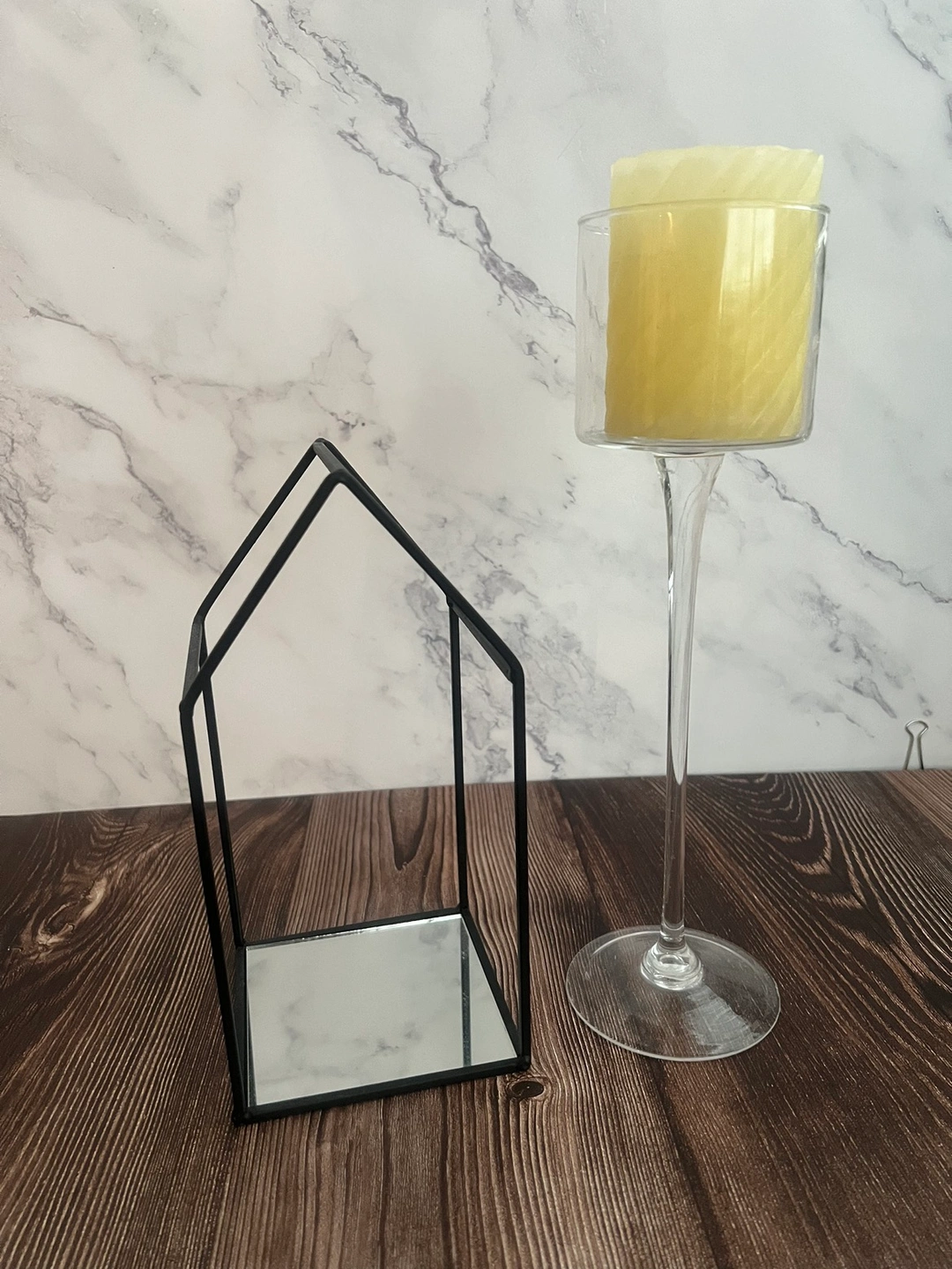 Random home decor items for sale. Includes, house shaped wire frame with mirrored bottom and tall 13” wine glass with candle.