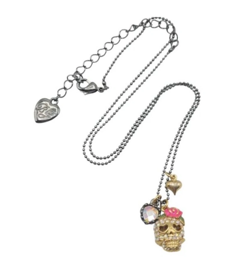 This Betsey Johnson Skull pendant necklace features a gold-tone skull accented with painted flowers and clear rhinestones, with two charms a gold-tone solid heart, and clear faceted silver trimmed heart charms attached to a ball chain necklace in pewter. The chain measures 18-inches in length, and the pendant measures approximately 0.8-inch high. Stamped BJ on a heart charm attached to the extension chain.