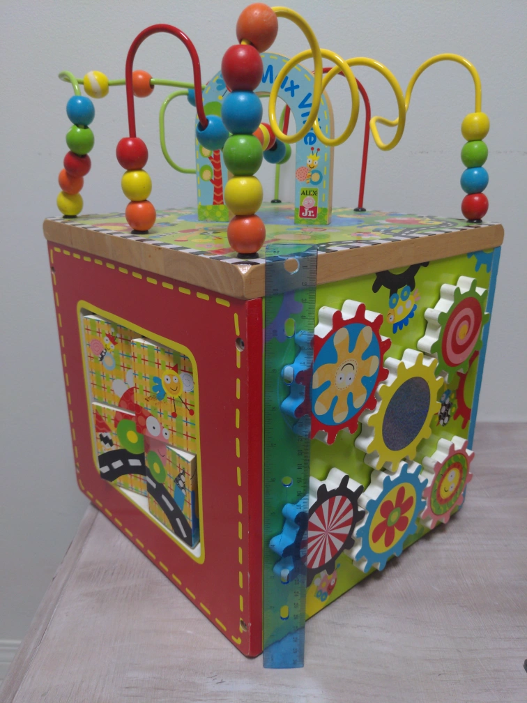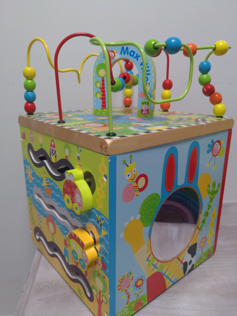 Selling a maxville toy interactive play cube for toddlers. Great for beginner motor skills for your toddler. Approximately 12" x 12" (not including moving beads on the top). About 17.5" tall if you include the beads on the top.