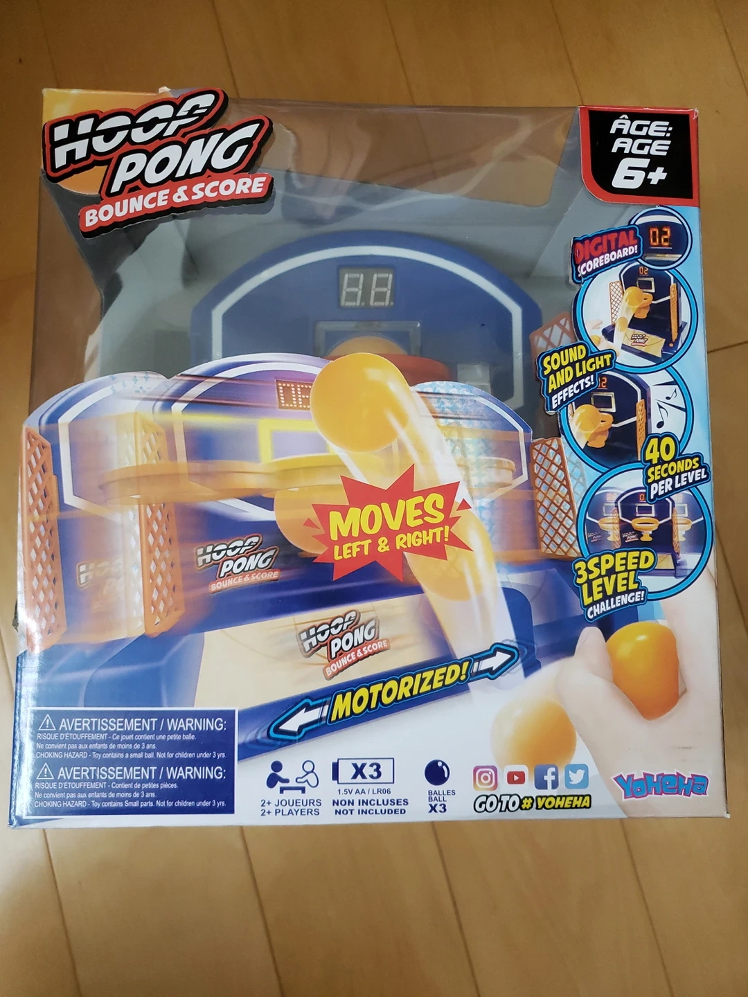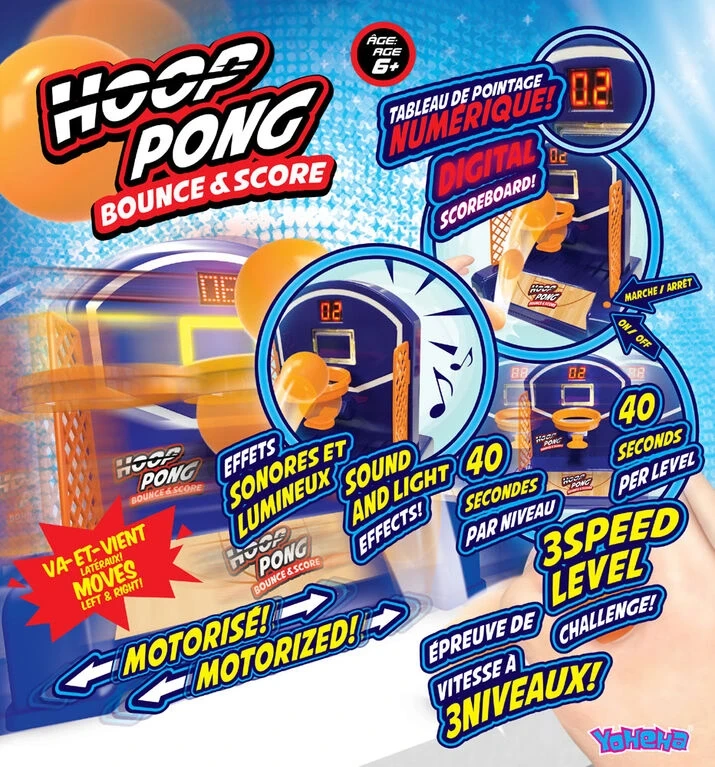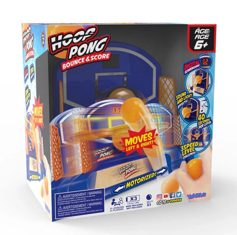 Hoop Pong will become your new favourite for family game night! It's a trendy new game that combines 2 challenging sports: ping pong and basketball. The motorized basketball court moves right and left making a challenging and entertaining game. With an electronic score counter and cheering sound effects, Hoop Pong will bring lots of fun to all ages!