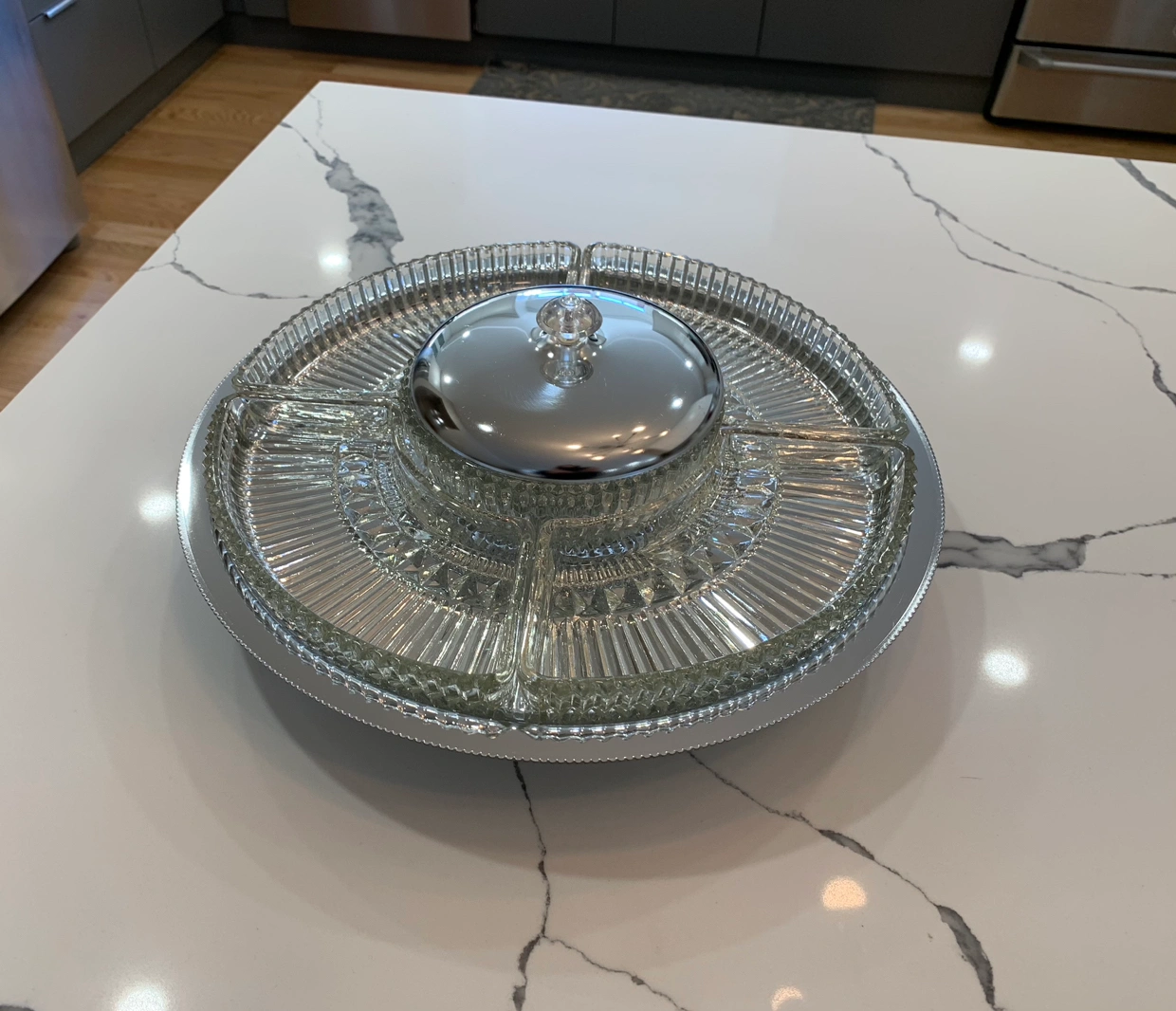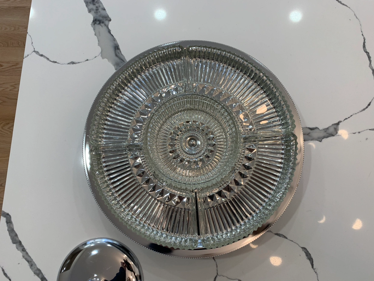 This Kromex Lazy Susan dish is composed of one round glass center dish with a chrome lid surrounded by four separate glass dishes. All of them fit on a chrome lazy Susan tray giving your guests easy access to all the goodies. The original sticker is still on the bottom of this Lazy Susan tray.