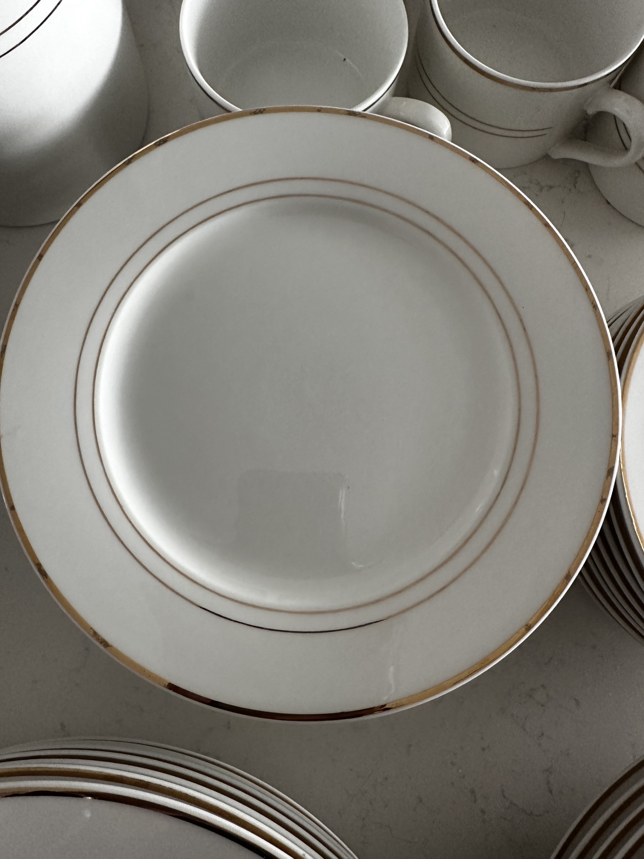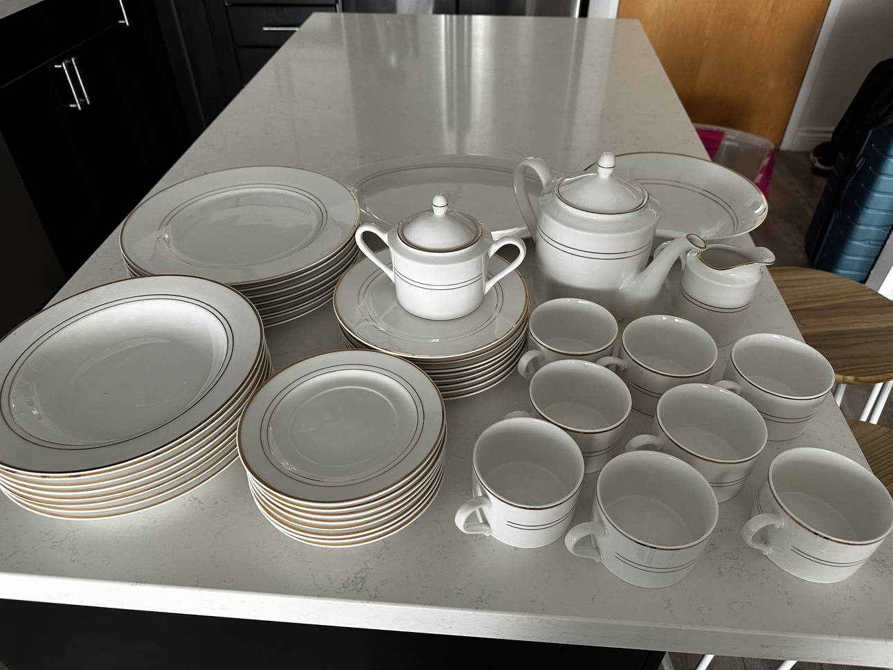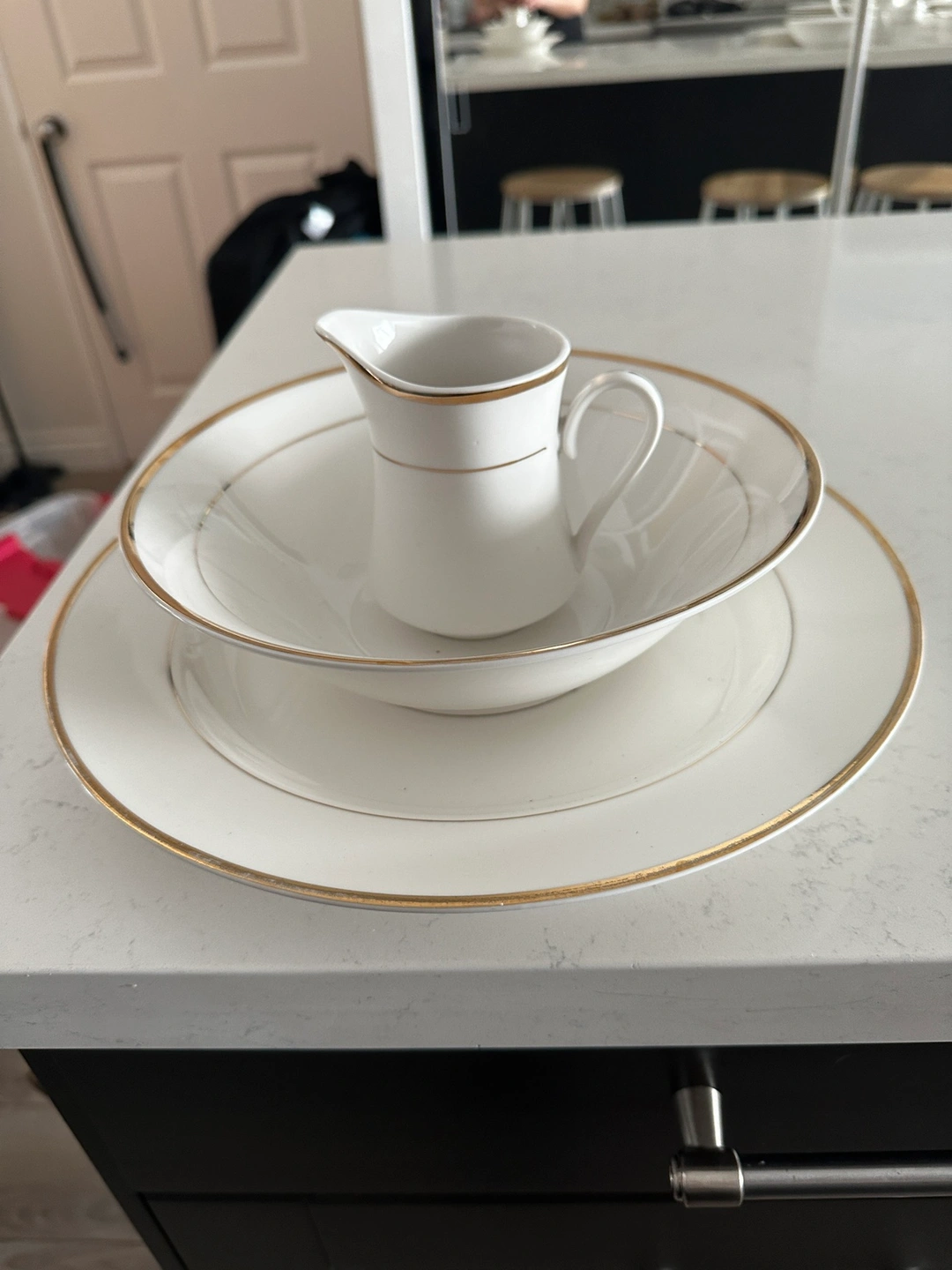 Beautiful and elegant, like new dinnerware for 8 people. Beautiful gold rimmed set.