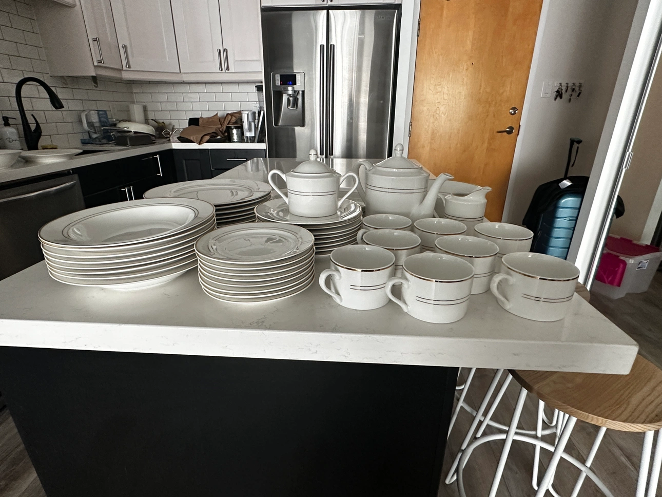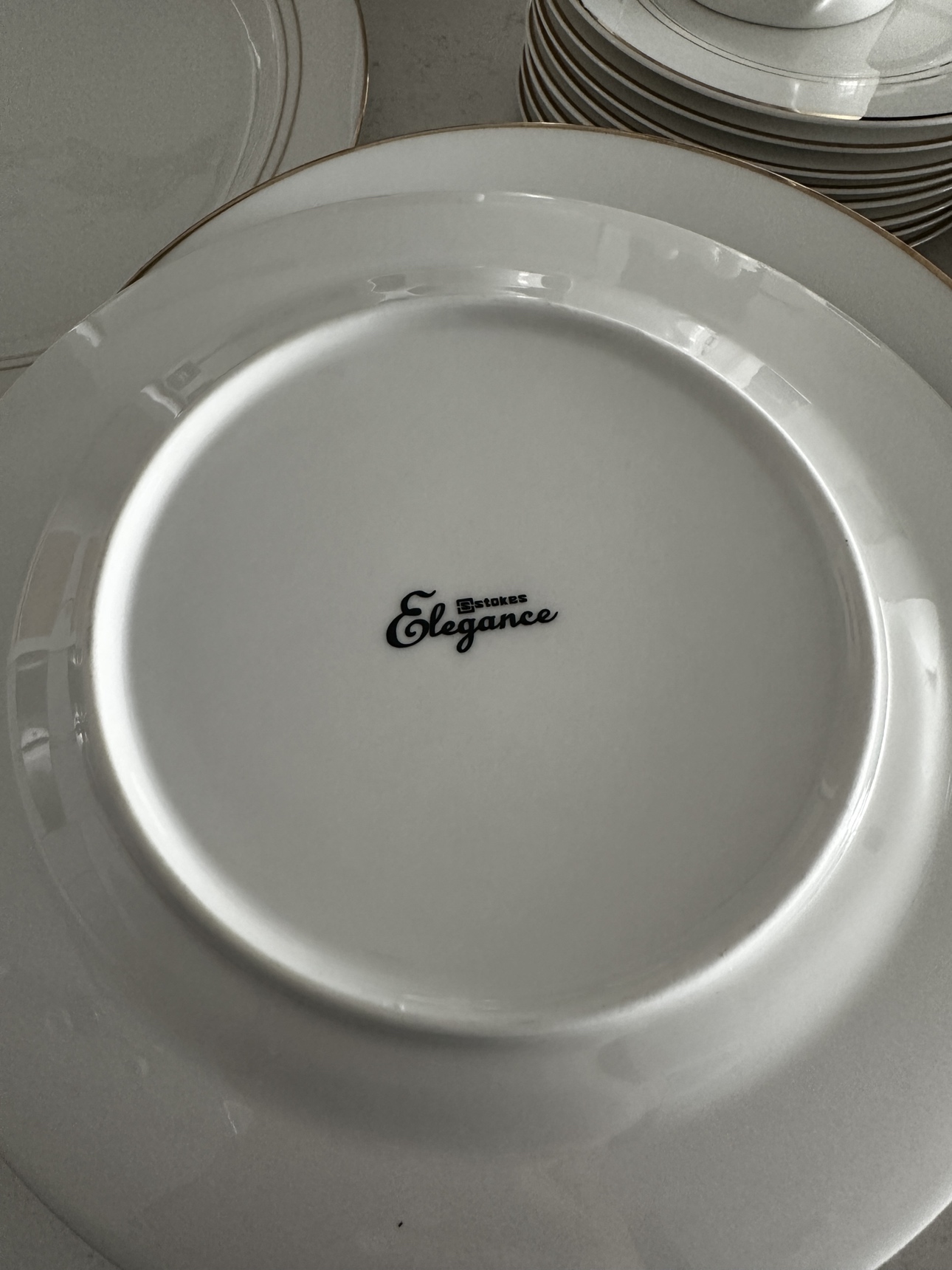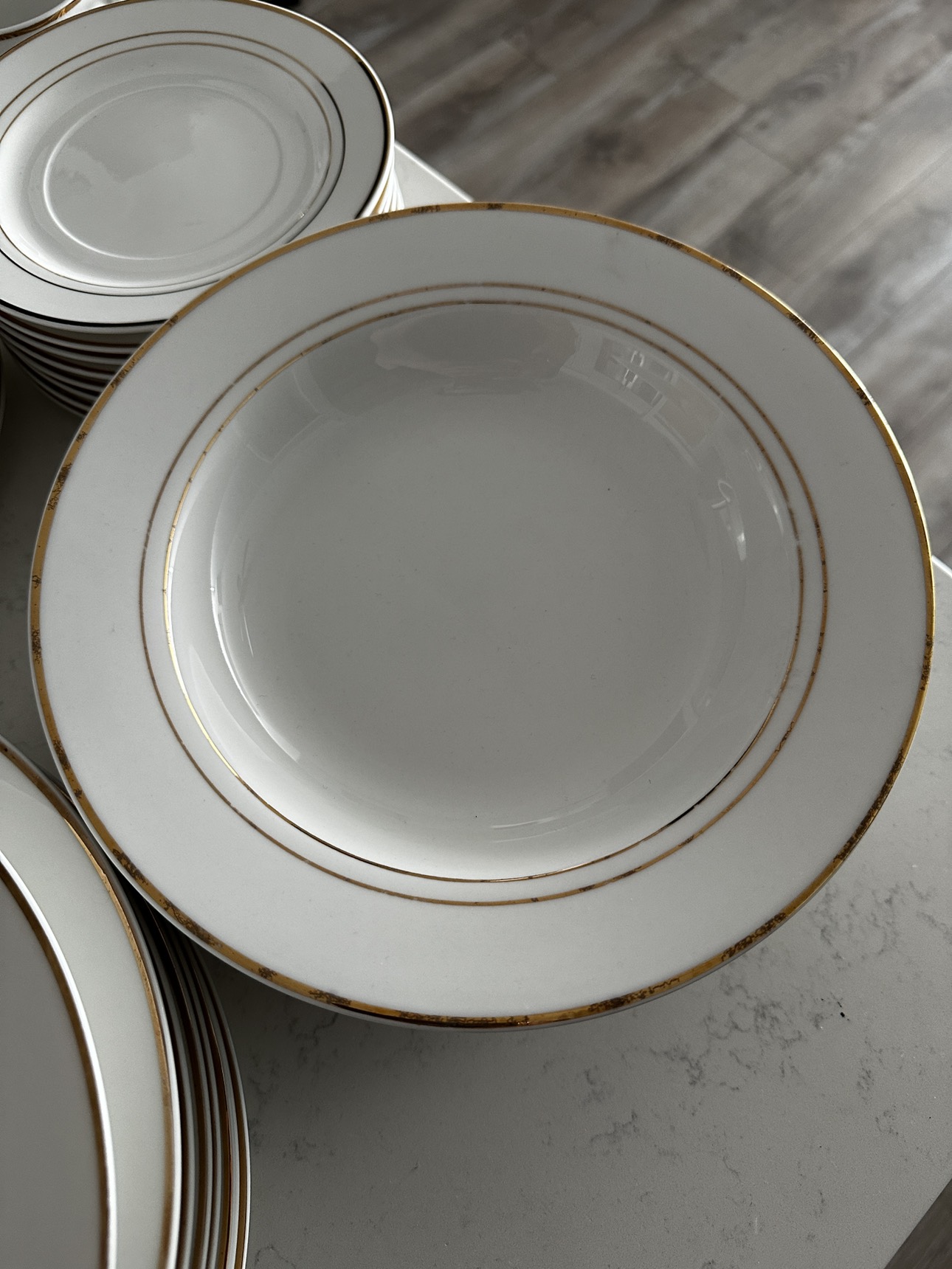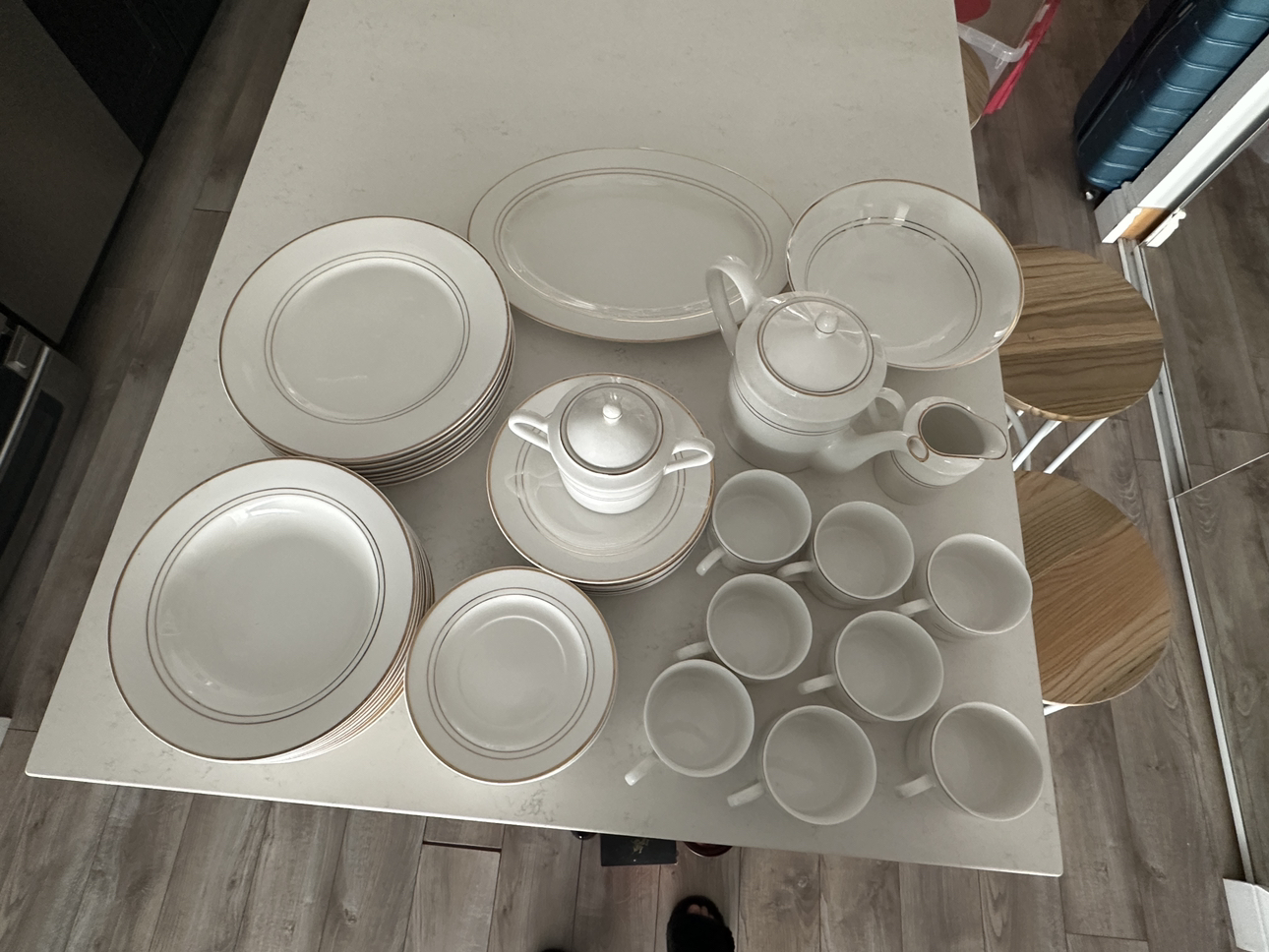 Beautiful and elegant, like new dinnerware for 8 people. Beautiful gold rimmed set.