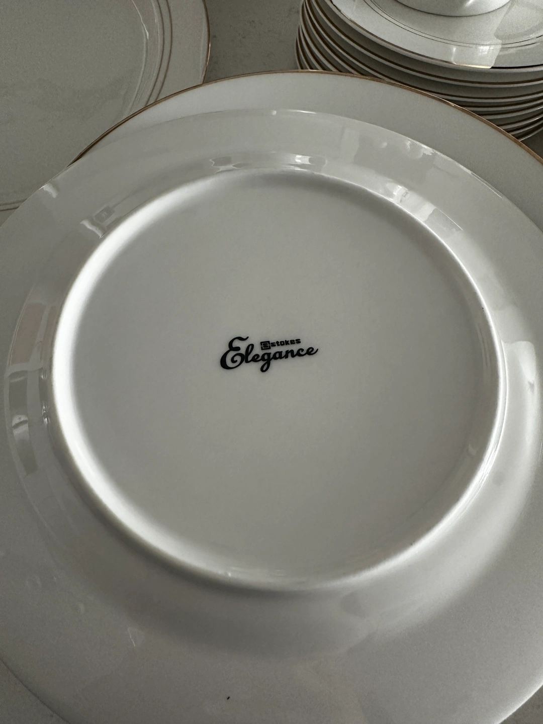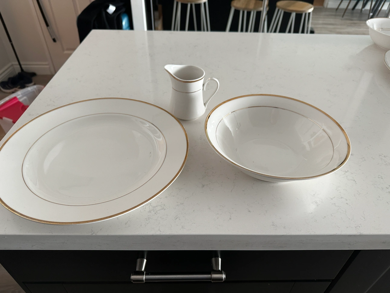 Included in set is extra platter, serving bowl and gravy pot with single gold rim (is from another set) but blends well with above set.