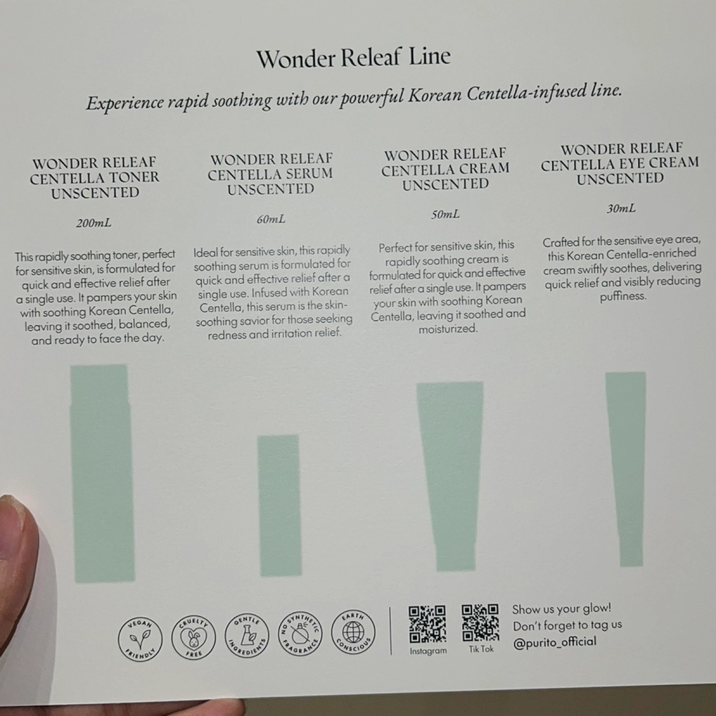 BRAND NEW Purito Wonder Releaf Unscented Cica / Centella Asiatica line for sensitive skin