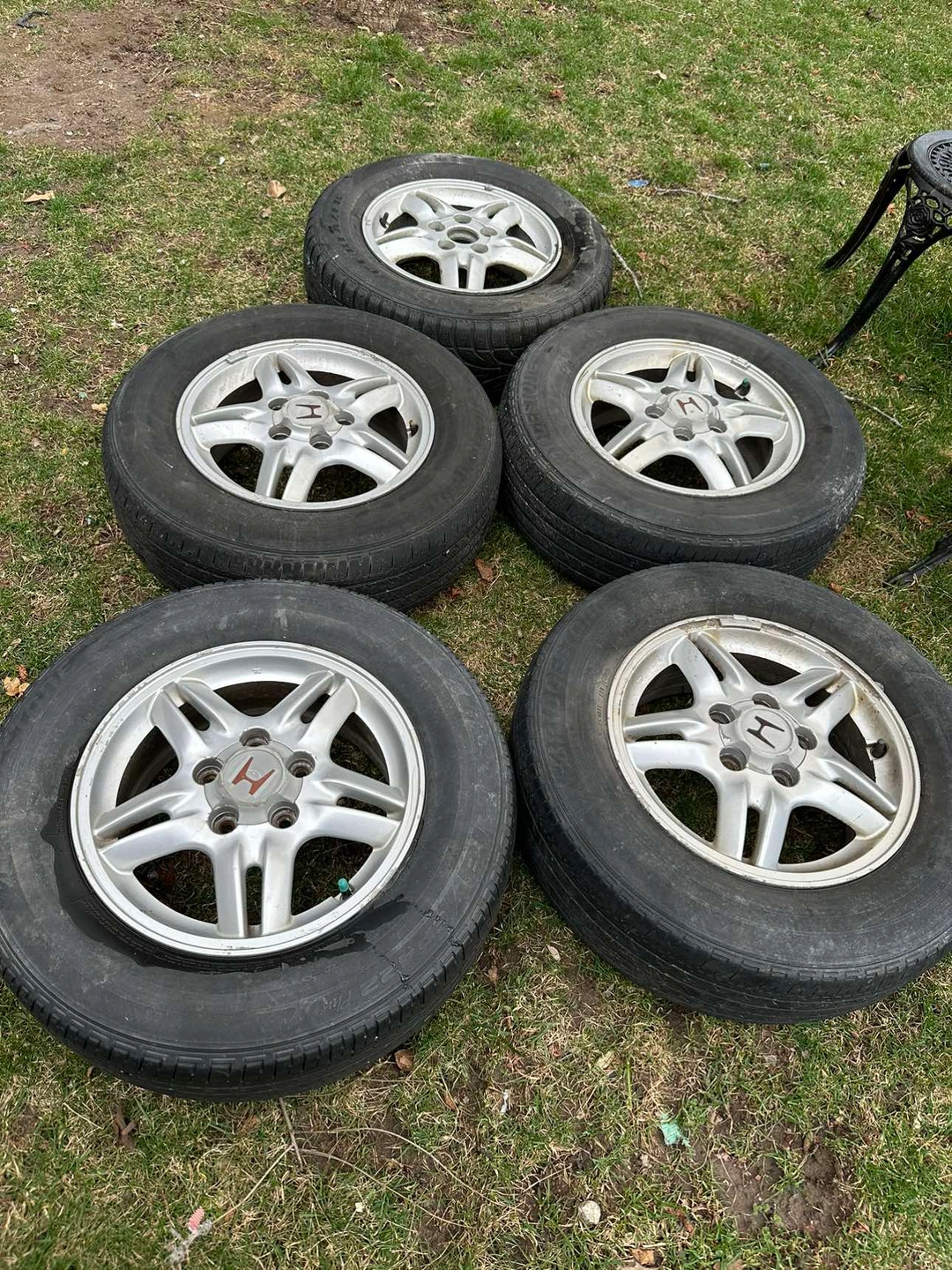Hi there, I have five first generation Honda CRV aluminum rims on tires 205/70R15 5x114. 3 bolt pattern 1997 to 2001 Honda CRV aluminum rims.