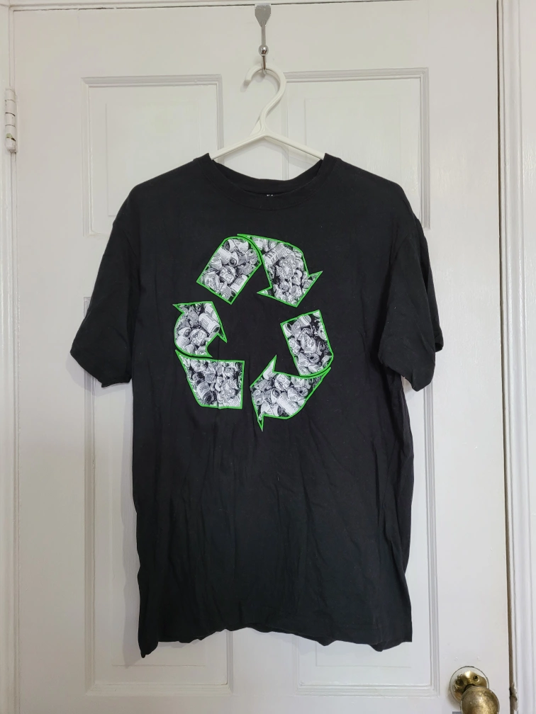 100% cotton, so probably a bit smaller than a men's size large. Would be a good gardening, hair-dyeing, or house cleaning shirt π