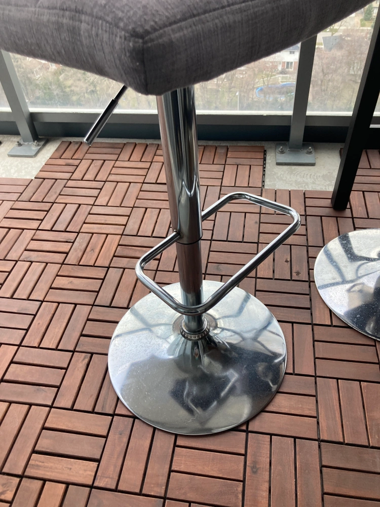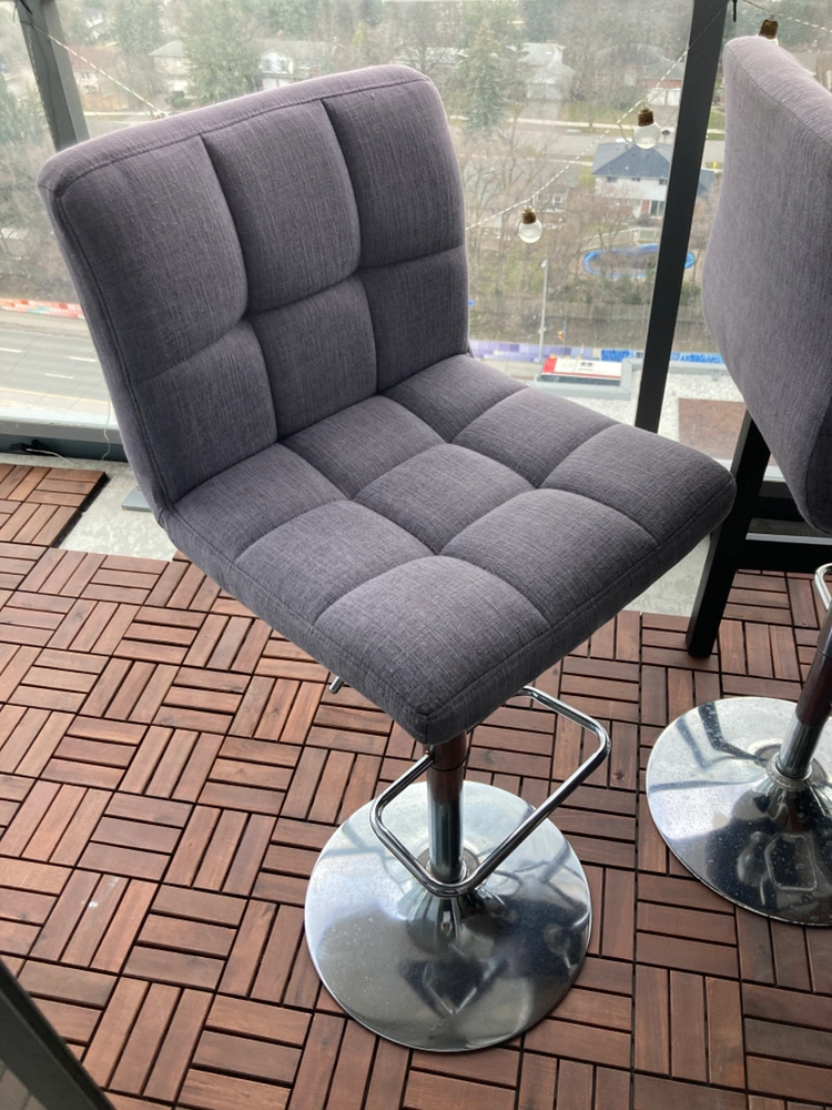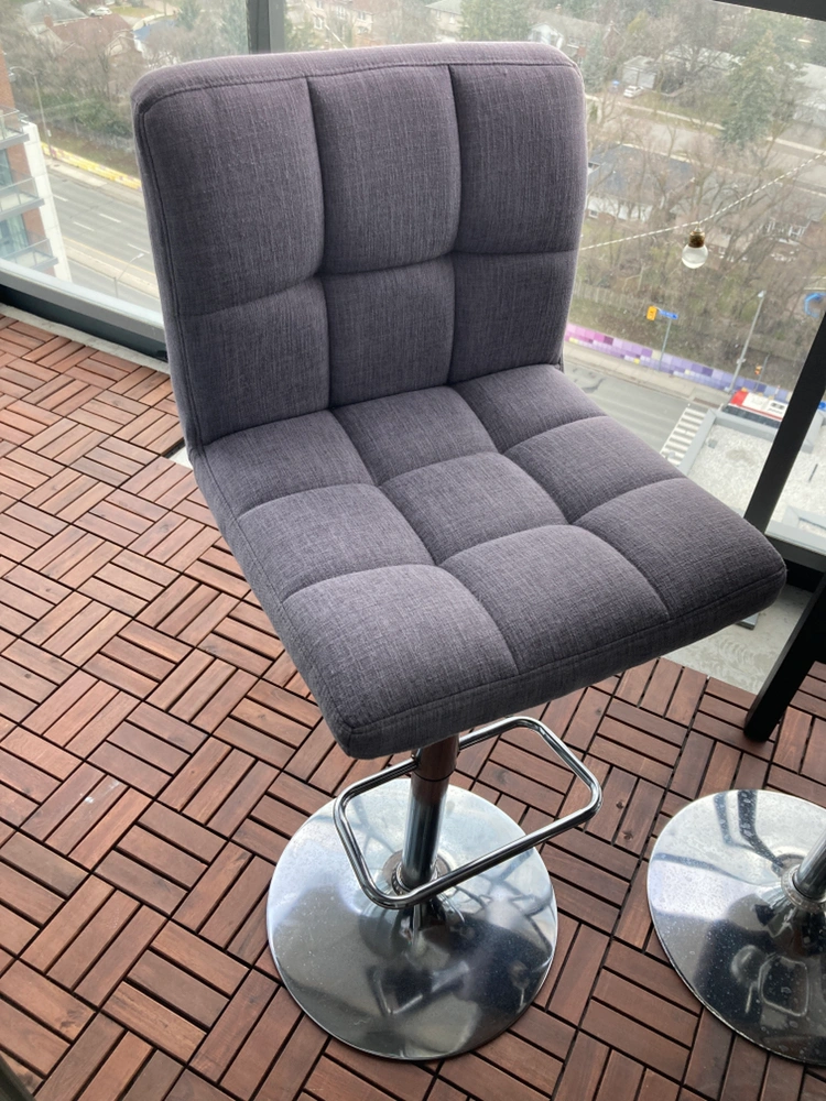 Gray fabric bar stools. I have 4 in total. $40 each. You can get 2 or 4. Clean condition and previously loved. Used them in our balcony and covered them with a thick plastic tarp during the winter.
