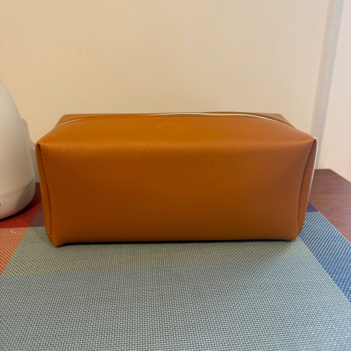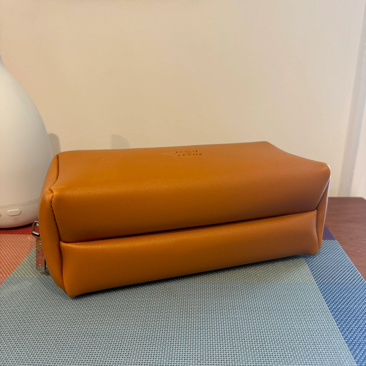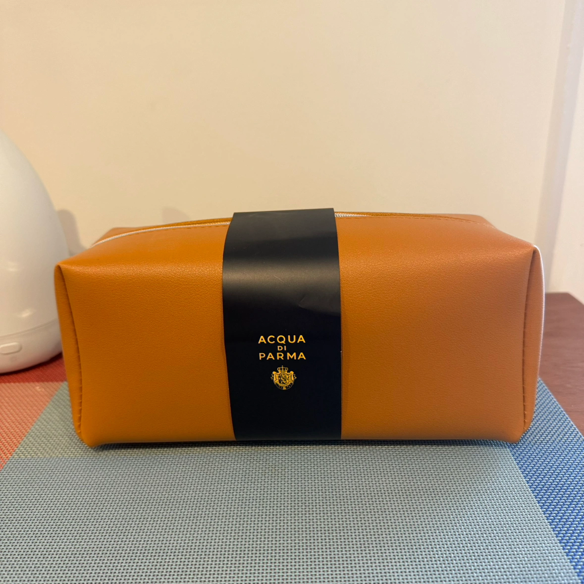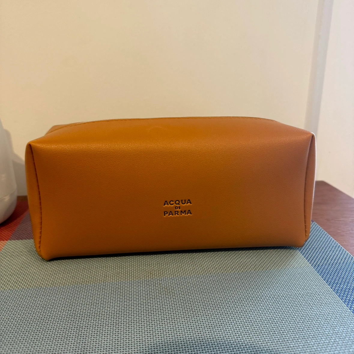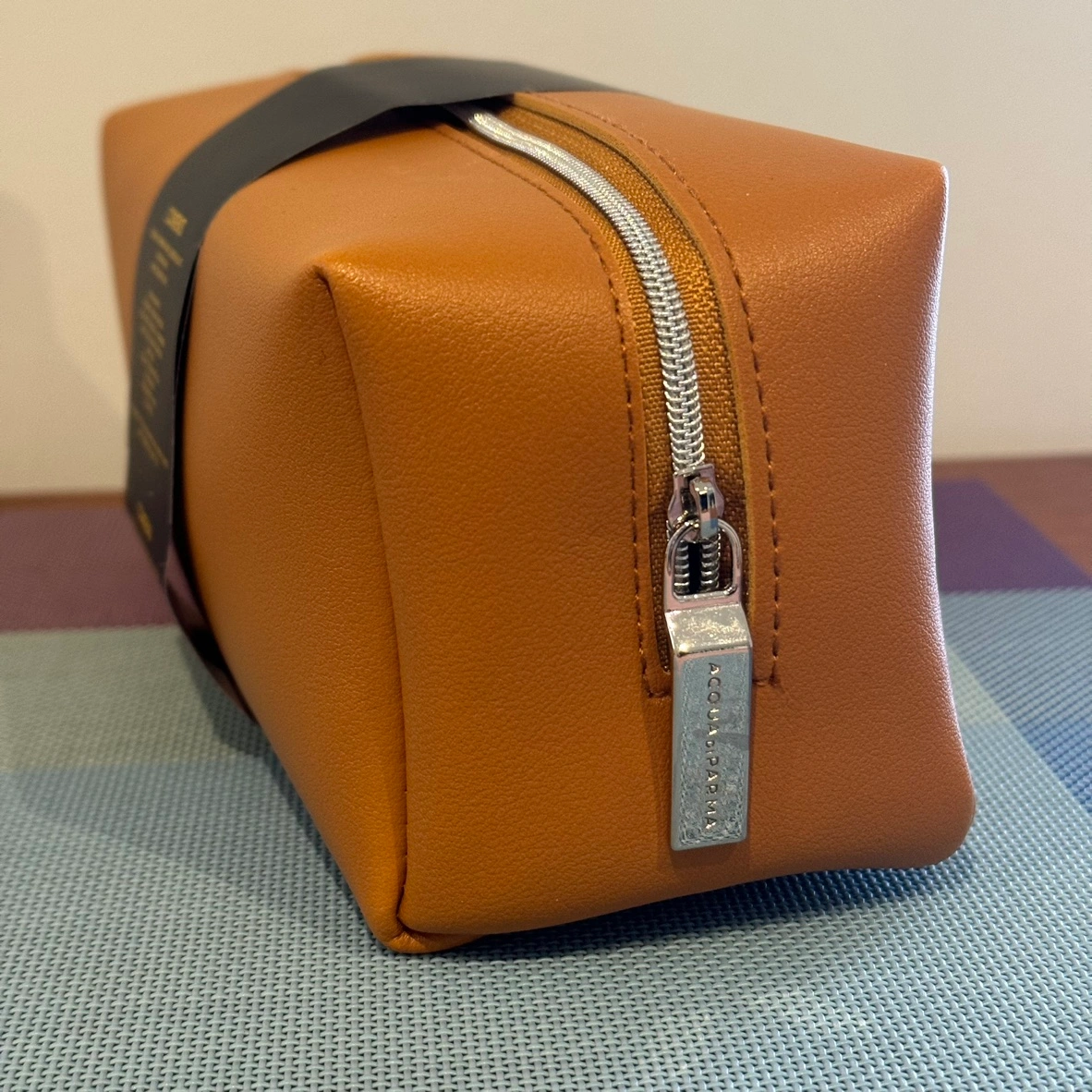 Beautiful cognac coloured case with silver zipper and debossed Acqua Di Parma wordmark on the front.