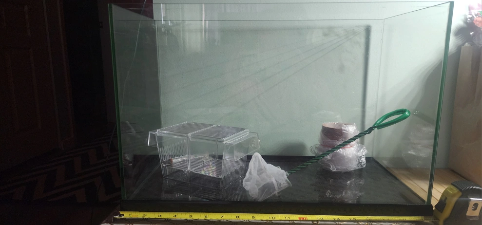 Aquarium comes with a net,3 small clay pots and a fish breeder case. I used to raise guppies with it before.Aquarium is still very new and with no scatch. L 20x W10xH13.5