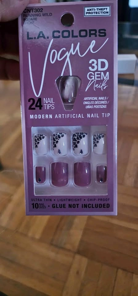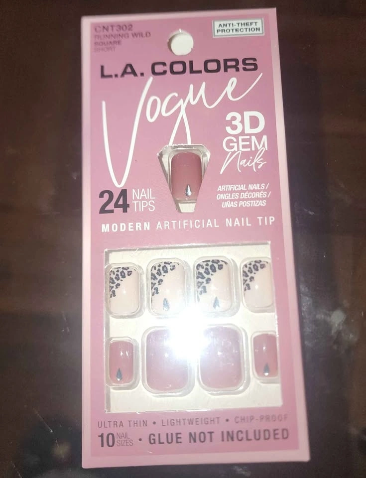 L.A. Colors Vogue 3D Gem artificial nails in the "Running Wild" design. Dusty pink cheetah print & gem nails. Short, square-shaped nails with a glossy finish, featuring a mix of solid rose wood/mauve color and animal print tips with 3D gem accents. The package contains 24 nail tips in 10 different sizes to ensure a proper fit. The nails are ultra-thin, lightweight, and chip-proof.