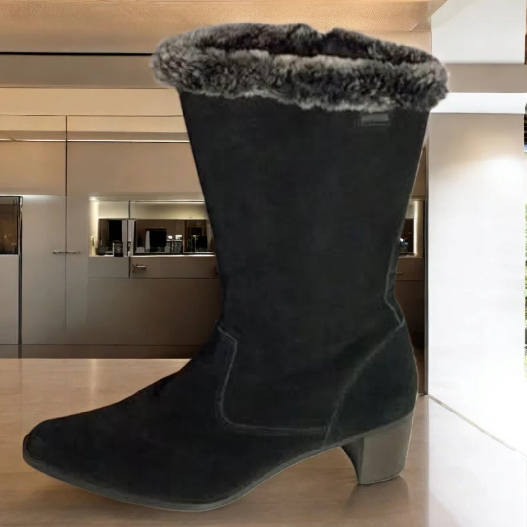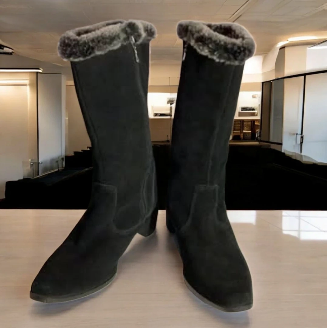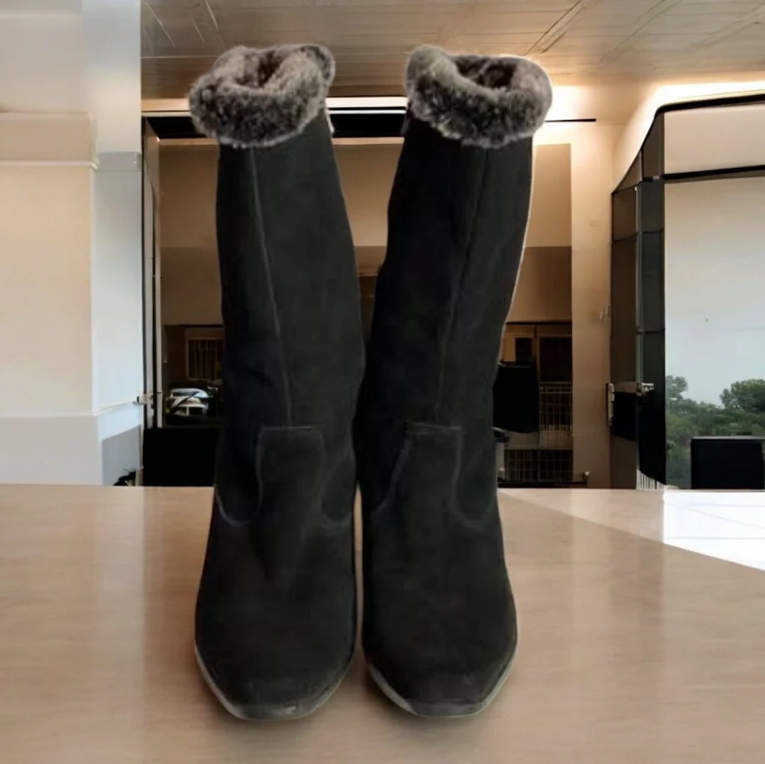 These black suede boots are lined with faux fur trim. They feature a full-length zipper for easy on and off. The heel height is moderate.