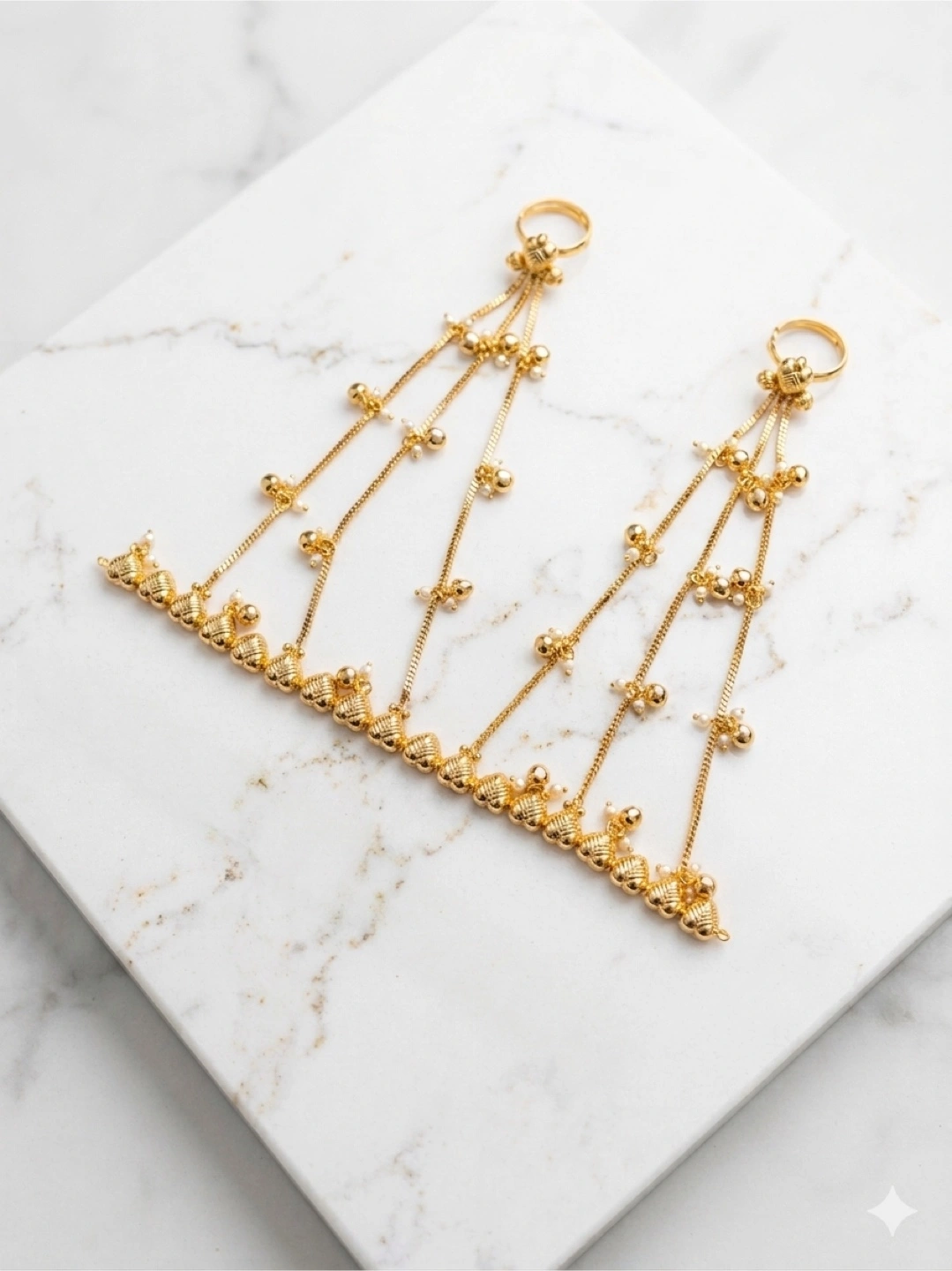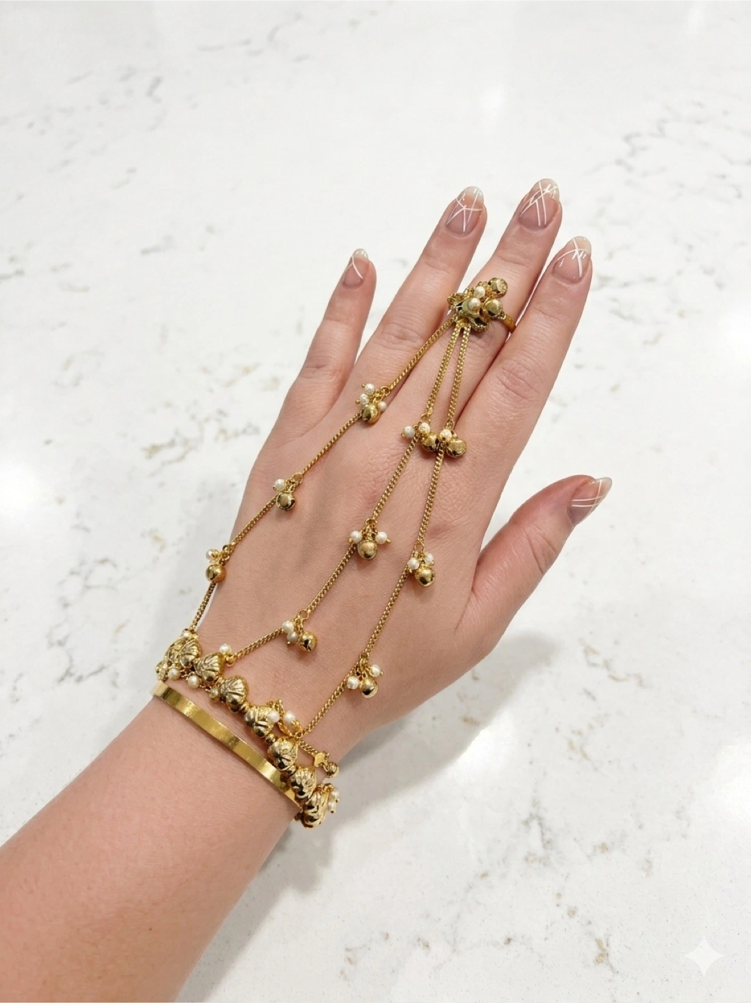 Beautiful gold-toned hand harness bracelet featuring delicate chains adorned with small beads and connecting to rings. It's designed to be worn on the hand and wrist. This statement piece adds an elegant touch to any outfit.