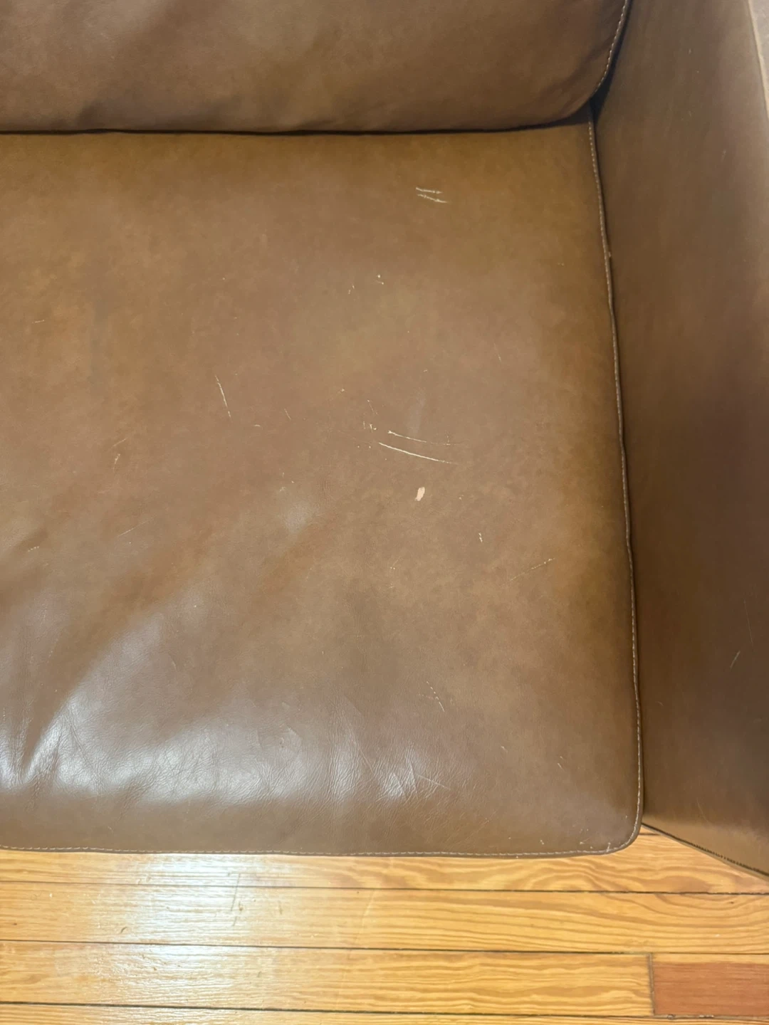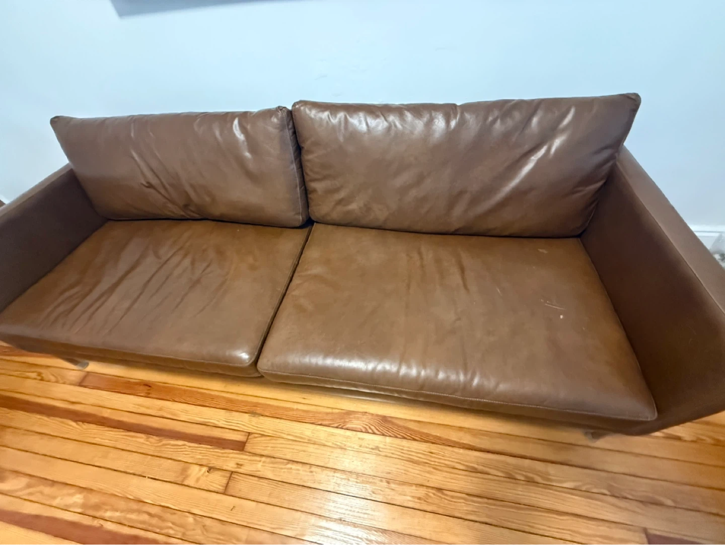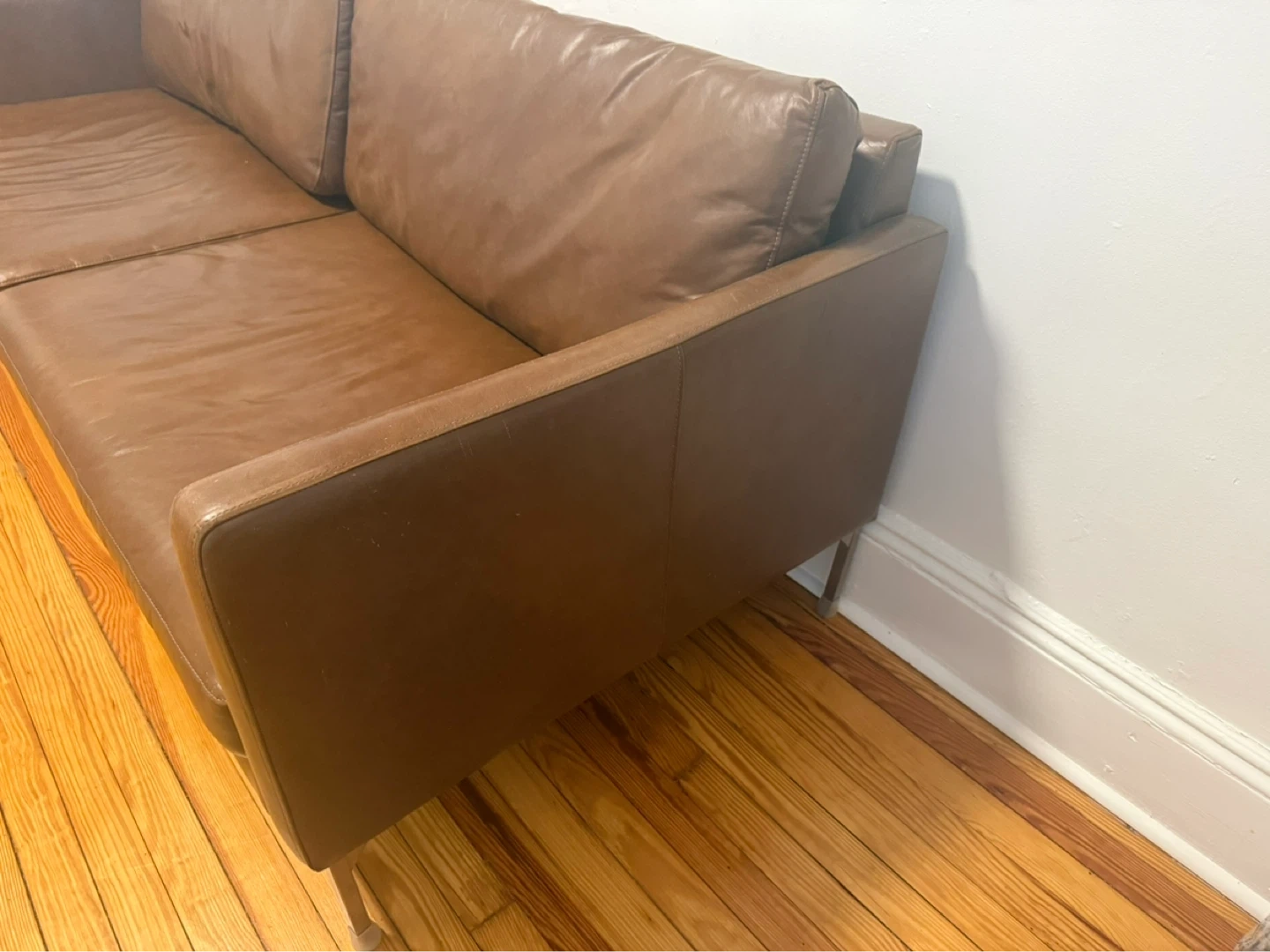 This is a two-seater brown leather sofa. It's made of leather and has metal legs. The sofa shows some signs of wear, like minor scratches on the seat.