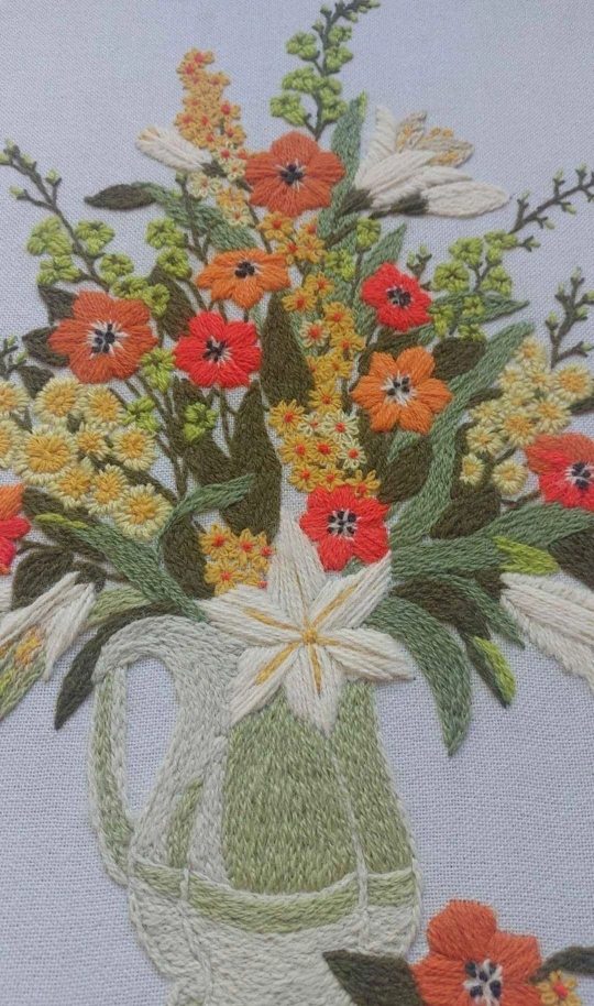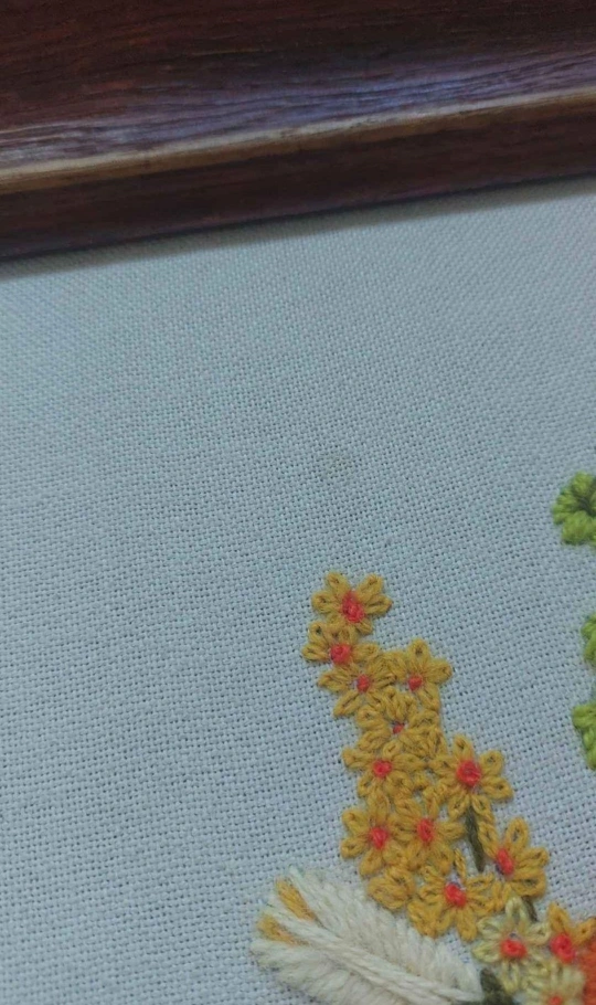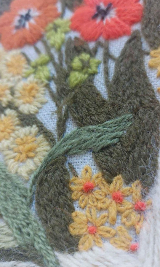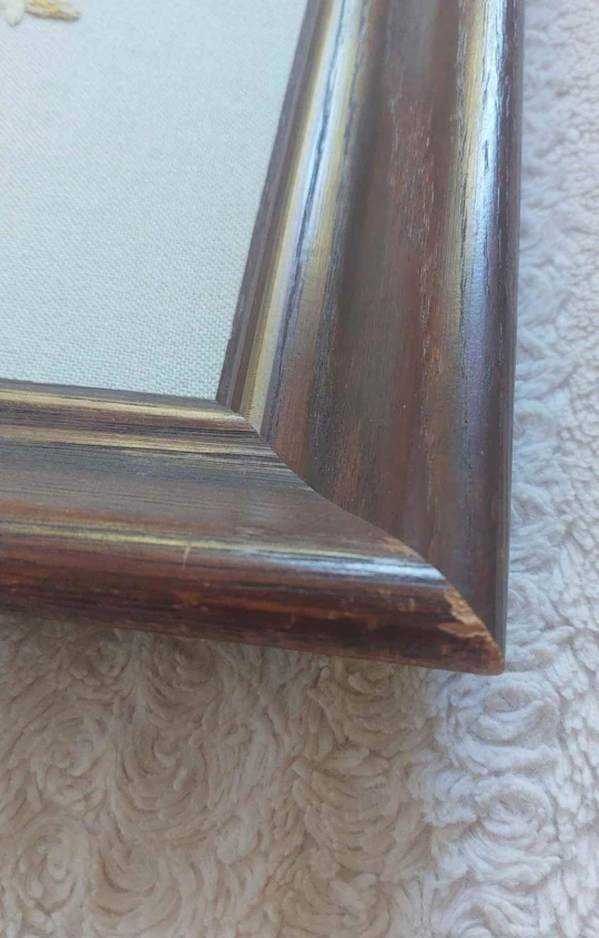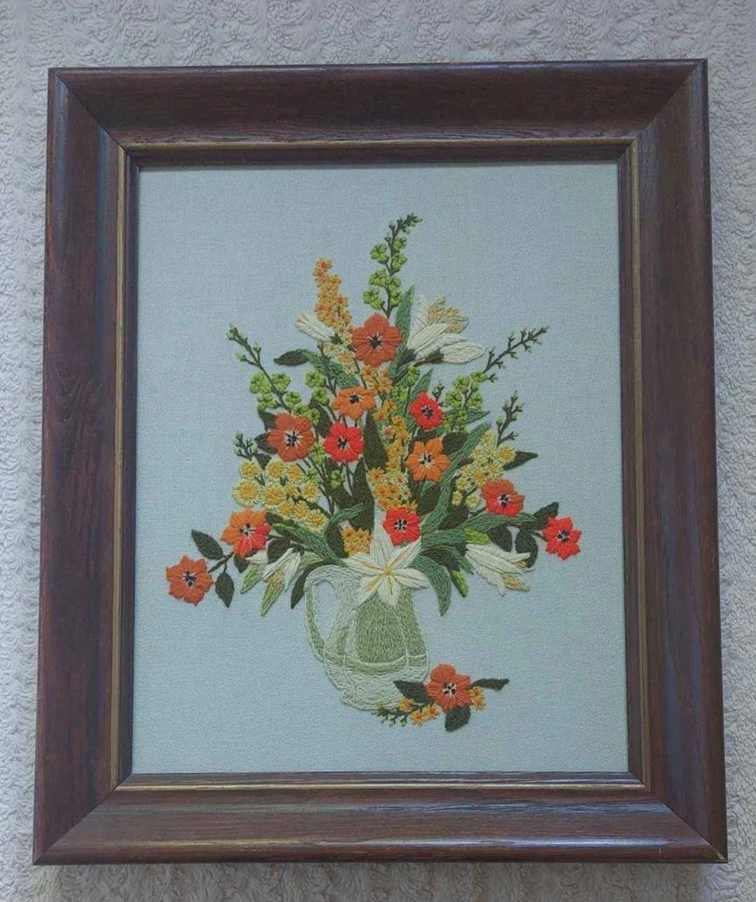 Lovely handmade crewel embroidery artwork. Tiny stain mark above yellow flowers as seen in photo. Not that obvious. In great overall condition. Wood framed.