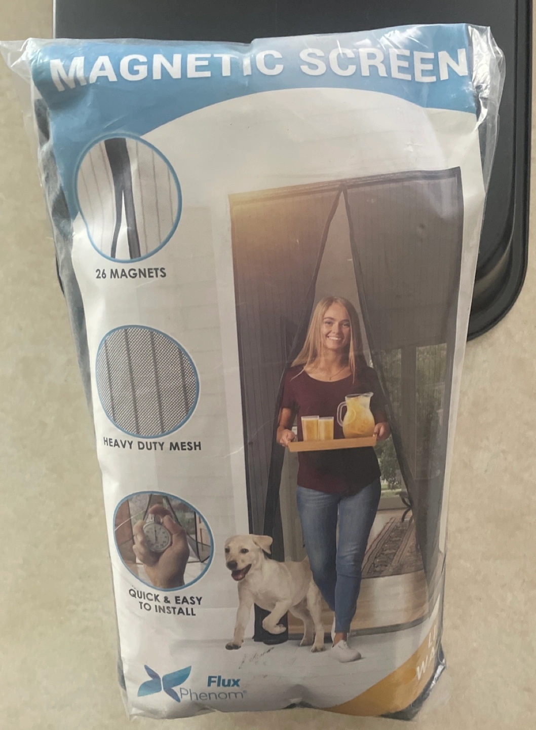 Installs instantly, heavy duty mesh screen door, polyester mesh with reinforced edges. Designed to withstand constant use by you and your pets. Simple no hands entry